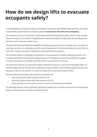 Our National Construction Code (NCC), the Building Code of Australia (BCA) is almost silent on how mobility-impaired occupants, the elderly or hospital patients may be evacuated vertically, other than providing them with stairs, which many are unable to use.