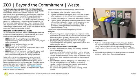 ZCO | Beyond the Commitment | Waste OPERATIONAL EMISSIONS BEYOND THE COMMITMENT Although the WorldGBC’s Net Zero Carbon Buildings (NZCB) Commitment does not include GHG emissions from operational waste, employee commute, business travel, fleet vehicles, and work from home (WFH), we understand that these are a significant part of our corporate emissions. Therefore, Integral Group’s CSER team has started to identify targets for measurement, reduction, and offsets within the Environmental Footprint roadmap. Future iterations of this ZCO Implementation Plan will expand upon these emissions. The following pages provide initial insight into our Plan related to some of these operational emissions. EMISSIONS FROM OPERATIONAL WASTE To address waste emissions, we will create targets to ensure the inclusion of waste generation and diversion reductions. Our Environmental Footprint Roadmap targets: • • • • •