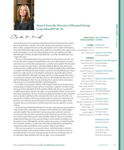 I have had numerous conversations with alumni who have shared anecdotes about Co-Chairs: Reunion Chair: their Deerfield days: a vignette of how Mrs. Boyden took a particular interest in Craig W. Fanning ’53 Mr. Nathaniel F. Emmons their studies; a poignant moment on the playing field; a dorm master who helped a homesick freshman through a particularly rough time; a schoolboy antic undiscovered H. Stanley Mansfield Jr. ’53 G’03 by the Headmaster. I never tire of hearing these stories, as it confirms my belief Marc L. McMurphy ’82 Regional Co-Chair (West): that although much has changed at Deerfield, the core of the Deerfield experience Mr. Christian Baldenhofer remains the same. Committee: The year in planned giving was busy and productive. Many alumni, parents, and Christian Baldenhofer ’60 Regional Co-Chairs (New England): friends who want to support Deerfield chose to do so through bequests, annuities, Edison W. Dick, Esq. ’55 Mr. John W. Broughan retirement account beneficiary designations, and other planned gifts. We welcomed Todd H. Eckler ’86 Mr. John S. Clarkeson 18 new members into the Frank L. and Helen Childs Boyden Society, while many Guilford W. Forbes ’41 existing members reaffirmed their intentions to include Deerfield in their estate plans. A complete list of Boyden Society members can be found at deerfield.edu/go/annual. James McB. Garvey Jr. ’46 Regional Co-Chair (South): Six donors made donations to Deerfield in exchange for charitable gift annuities, Henry S. Fox ’76 P’12 Mr. R. Marshall Evans Jr. for a total of $323,130. Although it is always sad to learn of the passing of friends, it Robert F. Herrick ’60 is most heartwarming to know that they chose to acknowledge the important role Robert B. Hiden Jr. ’51 Regional Co-Chairs (Midwest) that Deerfield played in their lives by including the Academy in their estate plans. John B. Horton ’52 P’89 Mr. James H. Cohen This past year we received $1,244,569 in realized bequests. John F. Kikoski Jr. ’59 P’83 Mr. Peter K. Noonan In an effort to increase the visibility of the Boyden Society we are in the process David C. Knight ’58 P’87 FP of expanding our Boyden Society Advisory Committee. Longtime volunteers Craig Joseph D. Lawrence ’54 Regional Co-Chair Fanning ’53, Stan Mansfield ’53 G’03, and Marc McMurphy ’82 are now joined by 21 additional members, listed to the right. I am most grateful to these volunteers for Richardson McKinney ’45 (New York/Middle Atlantic) their help and guidance. We hope to welcome additional members to the committee, Hon. Edward R. McPherson ’63 Mr. Joseph R. Robinson and eventually would like to have representatives from each class. Over the comGordon B. McWilliams ’47 P’77 ing year the committee will be discussing how best to reach out to classmates and Erwin H. Miller, Esq. ’58 Yearbook Co-Chairs: parents, as we make the case for this type of critical and longterm support of the Christopher G. Mumford ’64 P’01 Mr. Timothy F. Crowley Academy. If you are interested in volunteering in this manner, please be in touch Wm. T. Schwendler Jr. ’58 Mr. John Robert Glennie with me. Harold R. Talbot Jr. ’54 The Great Class of 1960 had a fabulous 50th Reunion. They had record participation, Christopher J. Tierney ’85 Programs Co-Chairs: with 74 classmates in attendance, and raised a total of $3,201,781 in gifts, pledges, and deferred gifts. The mood at their reunion was upbeat and lively, as friends Charles B. Updike ’57 Mr. Samuel A. Lewis Jr. reconnected with each other and with Deerfield. The great success of the reunion Robert Dell Vuyosevich ’72 Mr. Douglas A. Cummins was a direct result of the extensive time and effort of the 50th Reunion Committee, headed by Nat Emmons. It was a great privilege to work with the committee over Fundraising Co-Chair: the past two years. Although this was their milestone reunion, I certainly hope that Mr. Richard Lewisohn III the committee members, as well as the entire Class of 1960, will be coming back to campus frequently as Deerfield’s newest member of the Grand Classes. Members At Large: There are many aspects to a successful school—dedicated teachers, talented, The Rev. Robert F. Herrick motivated students, and top administrators with a vision of excellence. However, Mr. Edward P. Jaeger Deerfield also thrives because of the generosity of its donors and the devotion of its volunteers. Many thanks for the role you play—we are most grateful. Mr. Richard M. Sincerbeaux, Sr.