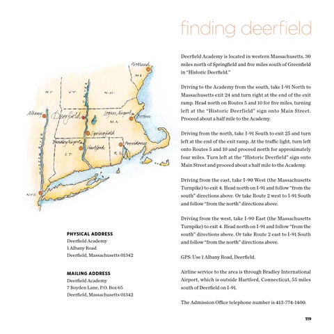 finding deerfield Deerfield Academy is located in western Massachusetts, 30 miles north of Springfield and five miles south of Greenfield in “Historic Deerfield.” Driving to the Academy from the south, take I-91 North to Massachusetts exit 24 and turn right at the end of the exit ramp. Head north on Routes 5 and 10 for five miles, turning left at the “Historic Deerfield” sign onto Main Street. Proceed about a half mile to the Academy. Driving from the north, take I-91 South to exit 25 and turn left at the end of the exit ramp. At the traffic light, turn left onto Routes 5 and 10 and proceed north for approximately four miles. Turn left at the “Historic Deerfield” sign onto Main Street and proceed about a half mile to the Academy. Driving from the east, take I-90 West (the Massachusetts Turnpike) to exit 4. Head north on I-91 and follow “from the south” directions above. Or take Route 2 west to I-91 South and follow “from the north” directions above. Driving from the west, take I-90 East (the Massachusetts Turnpike) to exit 4. Head north on I-91 and follow “from the PHYSICAL ADDRESS