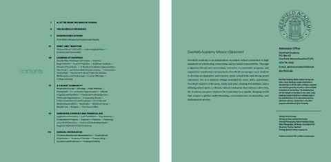 Editing: Patricia Gimbel Writing: Lu Stone and Deerfield Faculty Principal Photography: Gabriel Amadeus Cooney Other Photography: Jeff Brown, Jerry Gabriel ’50 Woodcuts: Timothy Engelland Printing: Quality Printing Company, Inc. Product printed on FSC certified recycled paper.