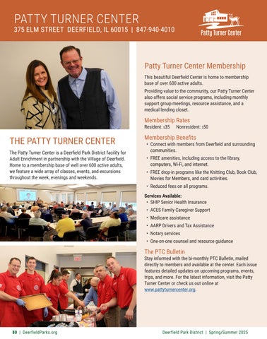 THE PATTY TURNER CENTER The Patty Turner Center is a Deerfield Park District facility for Adult Enrichment in partnership with the Village of Deerfield. Home to a membership base of well over 600 active adults, we feature a wide array of classes, events, and excursions throughout the week, evenings and weekends.