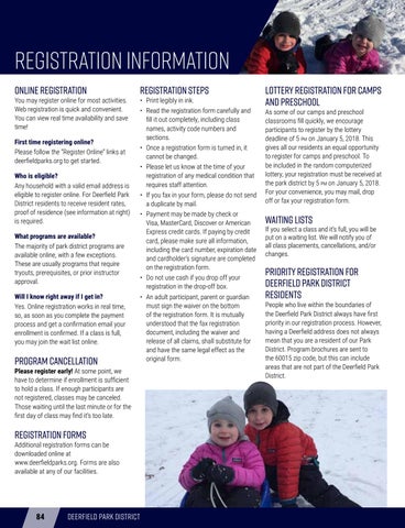 As some of our camps and preschool classrooms fill quickly, we encourage participants to register by the lottery deadline of 5 PM on January 5, 2018. This gives all our residents an equal opportunity to register for camps and preschool. To be included in the random computerized lottery, your registration must be received at the park district by 5 PM on January 5, 2018. For your convenience, you may mail, drop off or fax your registration form.