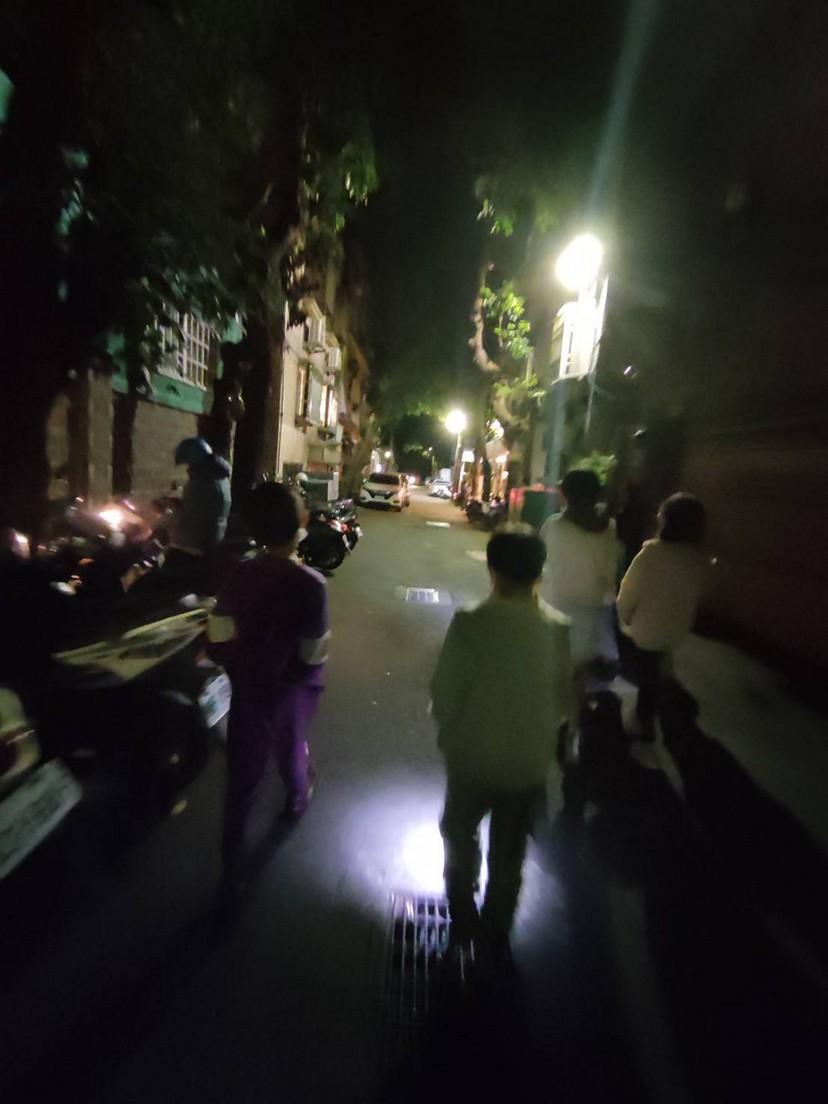 走在路上,我用手電筒照三角錐,地