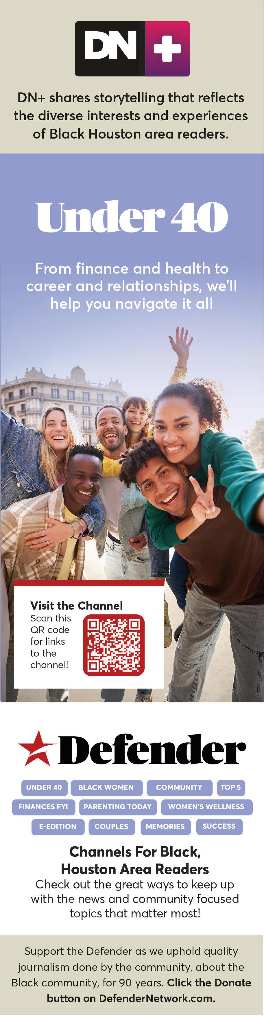 firsthand. The Defender is experiencing the same challenges. We’re tired of seeing our fellow Black media outlets close when the work they (we) do is even more vital today than ever before So, if you (readers, communitymembers,corporateHouston) appreciate the educating, entertaining, and empowering work produced by the Defender, show your support by making a financial contribution or by committing to advertisetooneofthenation’slargestAfrican American populations.