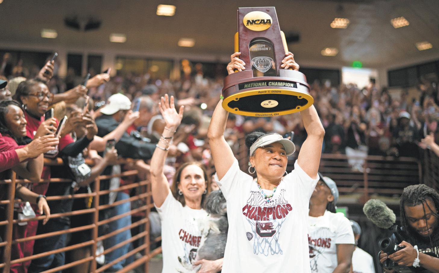 South Carolina coach Dawn Staley raises the NCAA Women’s Basketball Championship trophy at a celebration at the Colonial Life Arena on April 8, 2024. The South Carolina Gamecocks defeated the Iowa Hawkeyes 87-75 to cap a perfect season. (Photo by Sean Rayford/Getty Images)