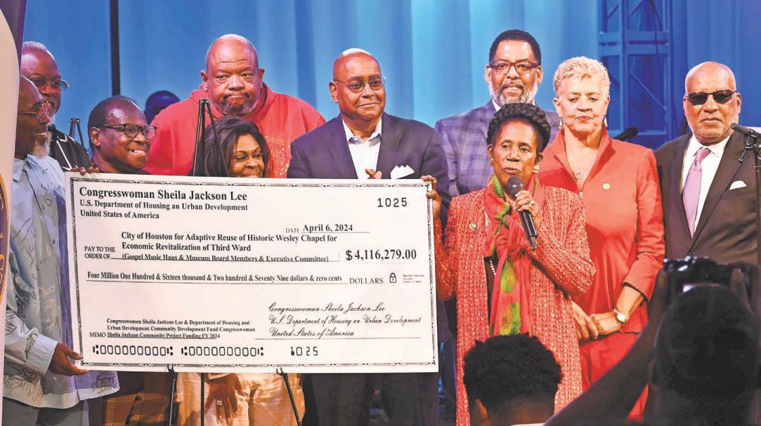 That’s what Congresswoman Sheila Jackson Lee focused on during a recent gathering at St. John’s Downtown (2201 Pierce St.), where she made the official announcement of the museum and revealed, in oversized check fashion, the $4.1 million in funds from the U.S. Department of Housing and Urban Development (HUD) designated for the “adaptive reuse” of the Wesley Chapel building for the “economic revitalization of Third Ward.”