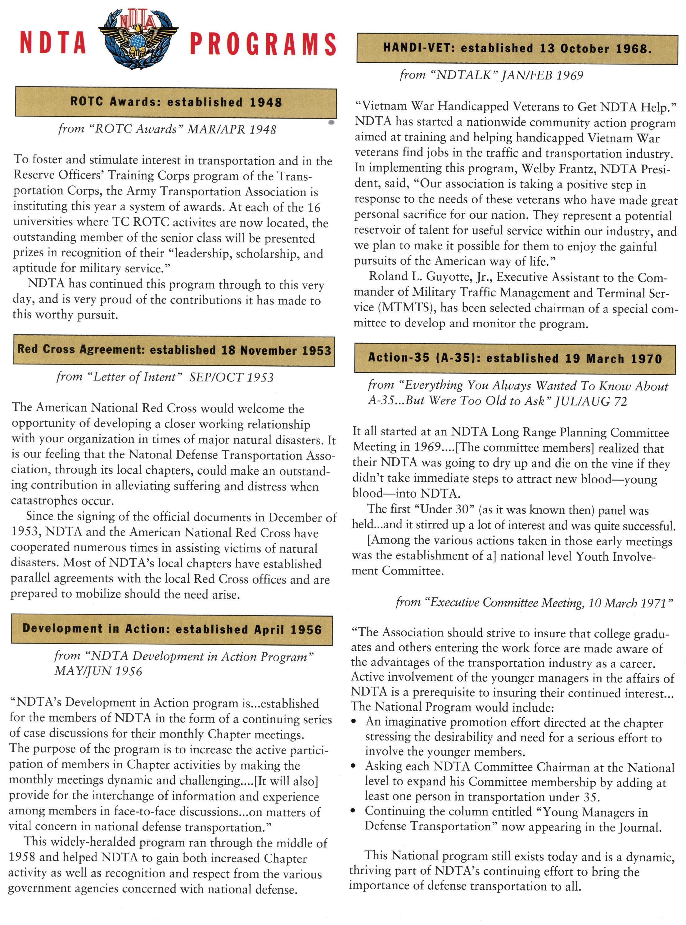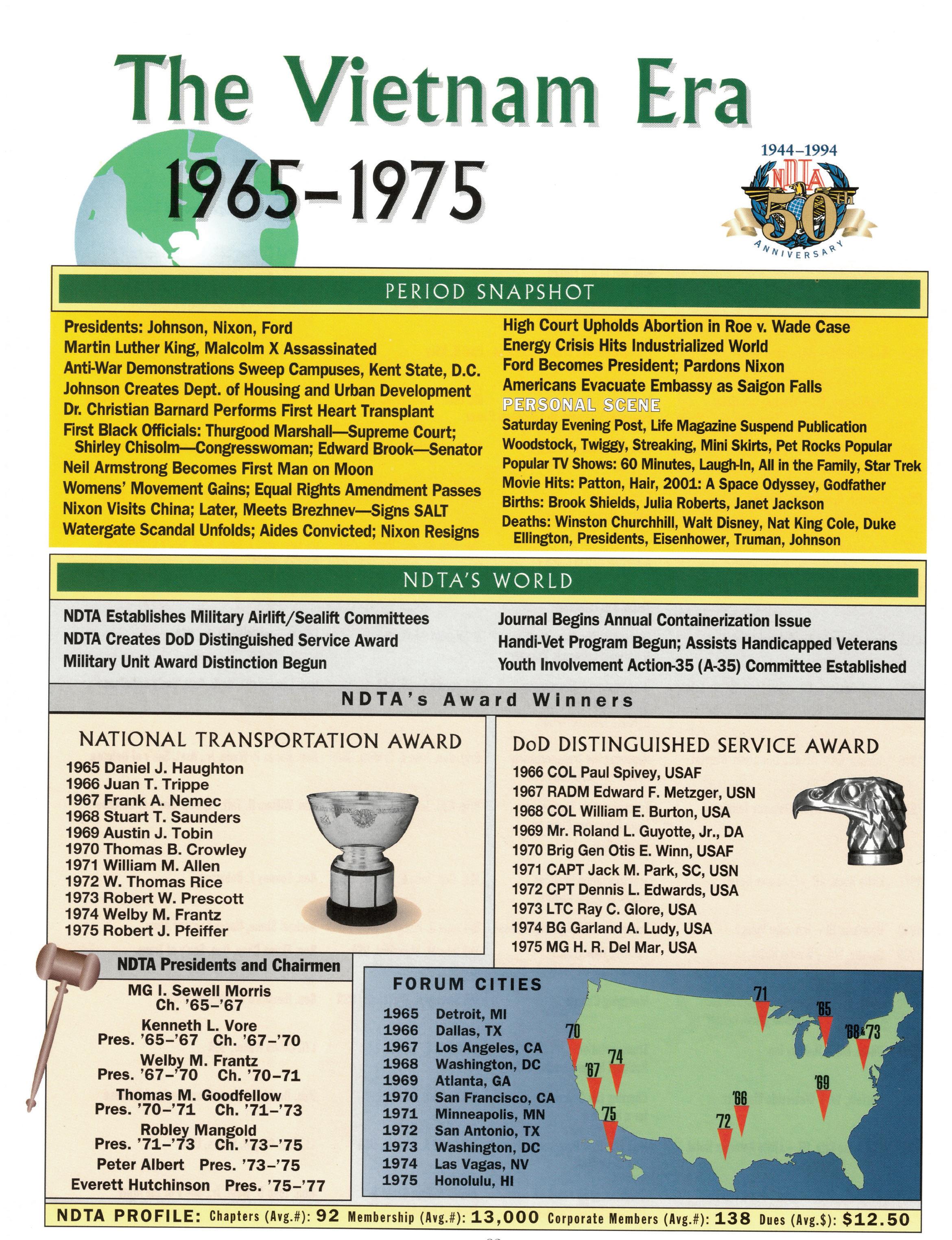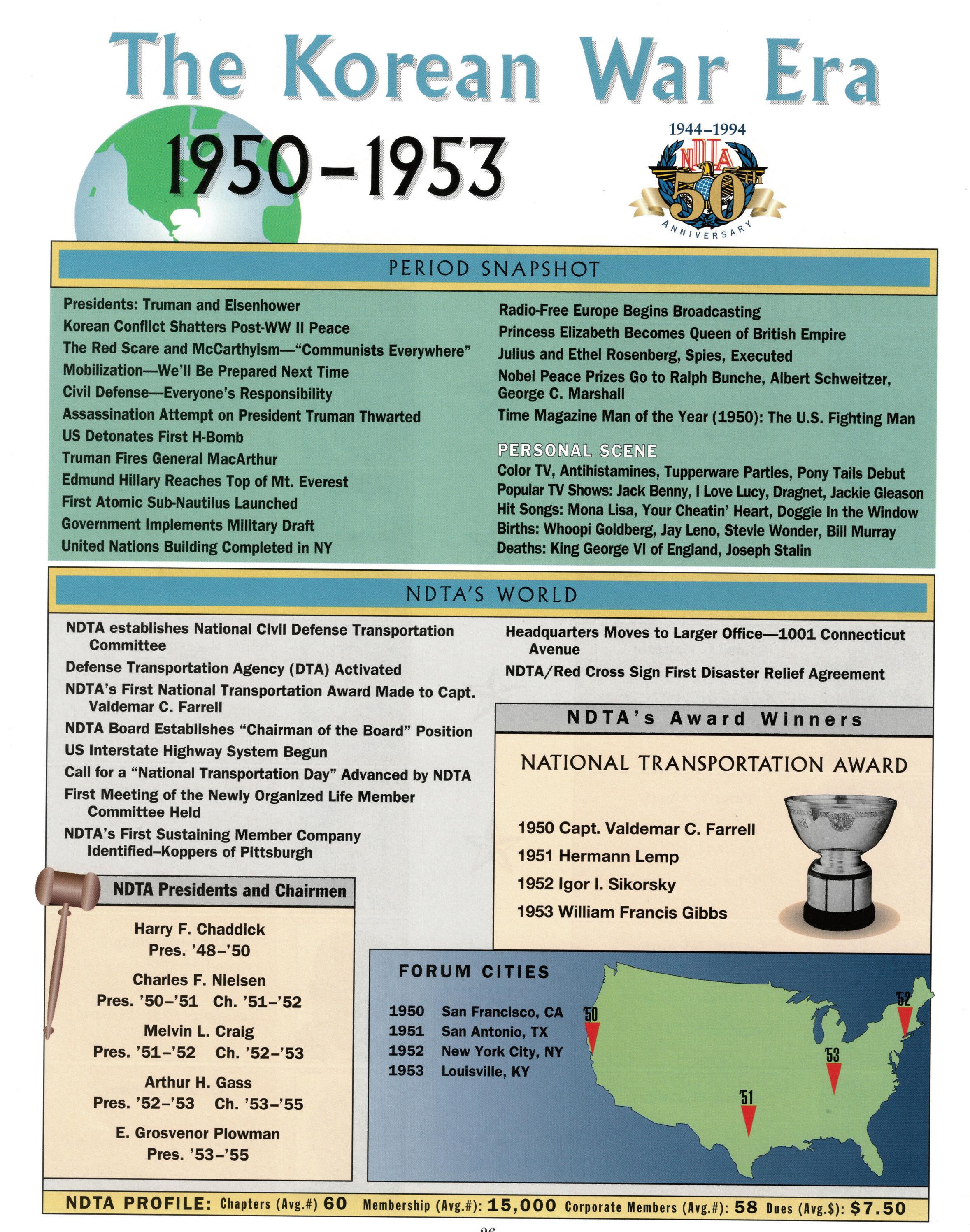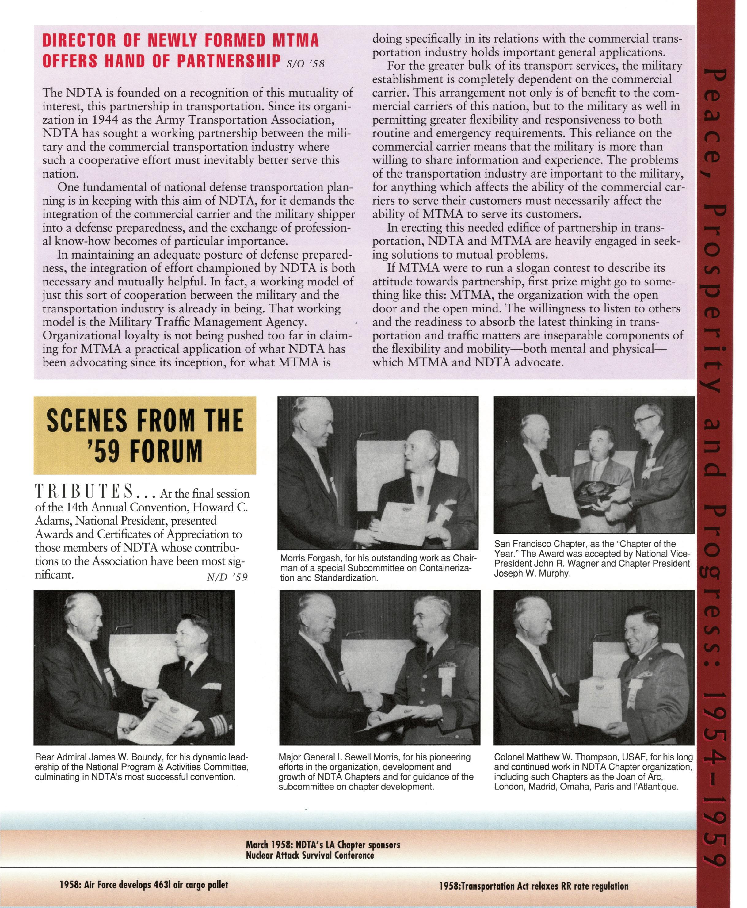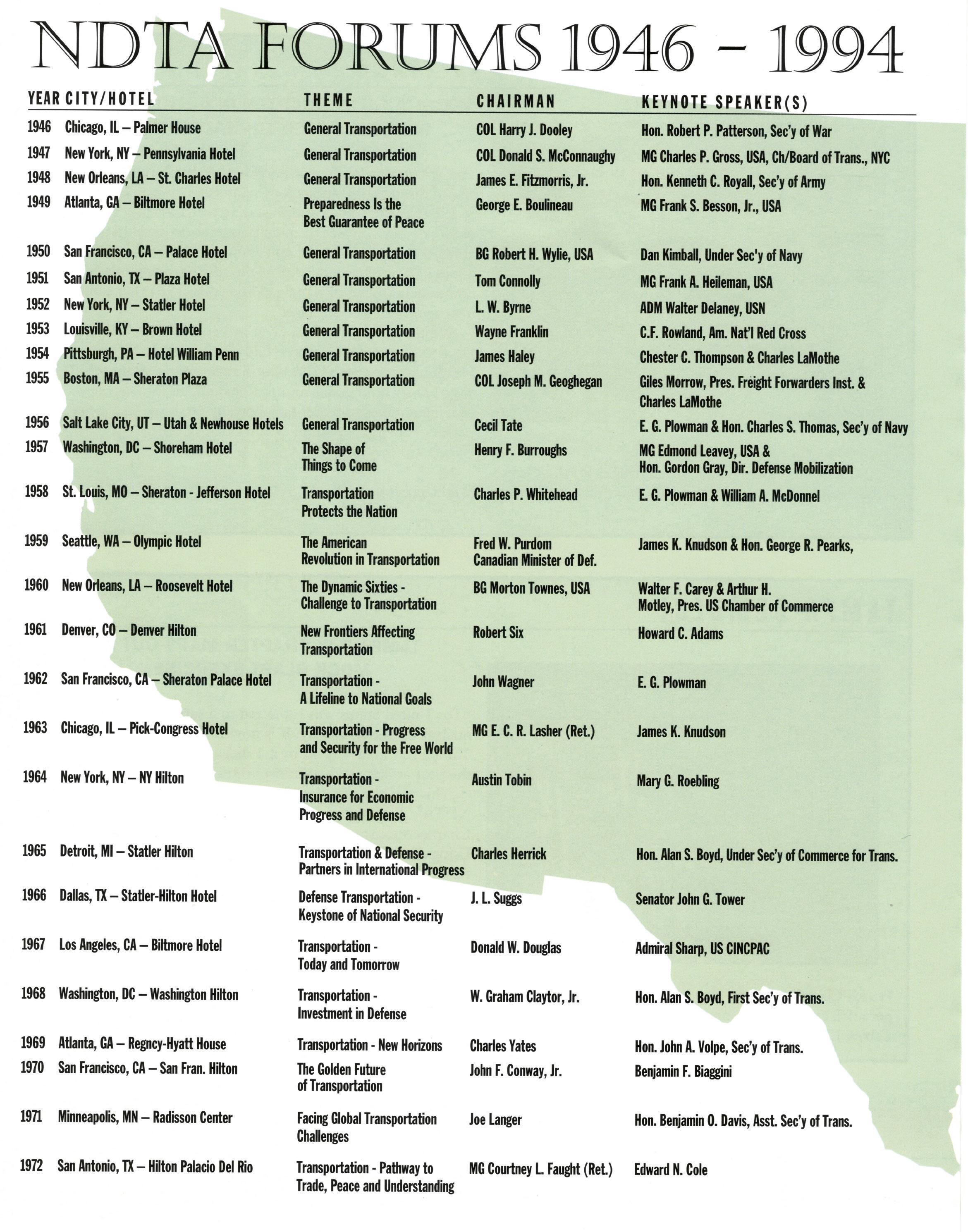 As we celebrate the 75th Anniversary of NDTA, it is good for us to take a moment and reflect on the many challenges faced and overcome by our Nation. Also, to think about the impact that NDTA members have made through countless meetings, con- ferences, expositions, and forums held all over the world, including the United States, Alaska, Hawaii, Europe, and Asia. To help you reflect, we have assembled this special Anniversary Yearbook encompassing all 75 years of our history into one book! Additionally, we commissioned a very special piece of commemorative art that we think tells the NDTA story. We hope you will enjoy them both. In the yearbook, we salute our Service men and women, NDTA members, chapters, government, and industry partners along with everyone in the logistics and transportation enterprise who understands that “nothing hap- pens until something moves!” And at NDTA, we believe that keeping people and things moving in support of our government is what we are all about.