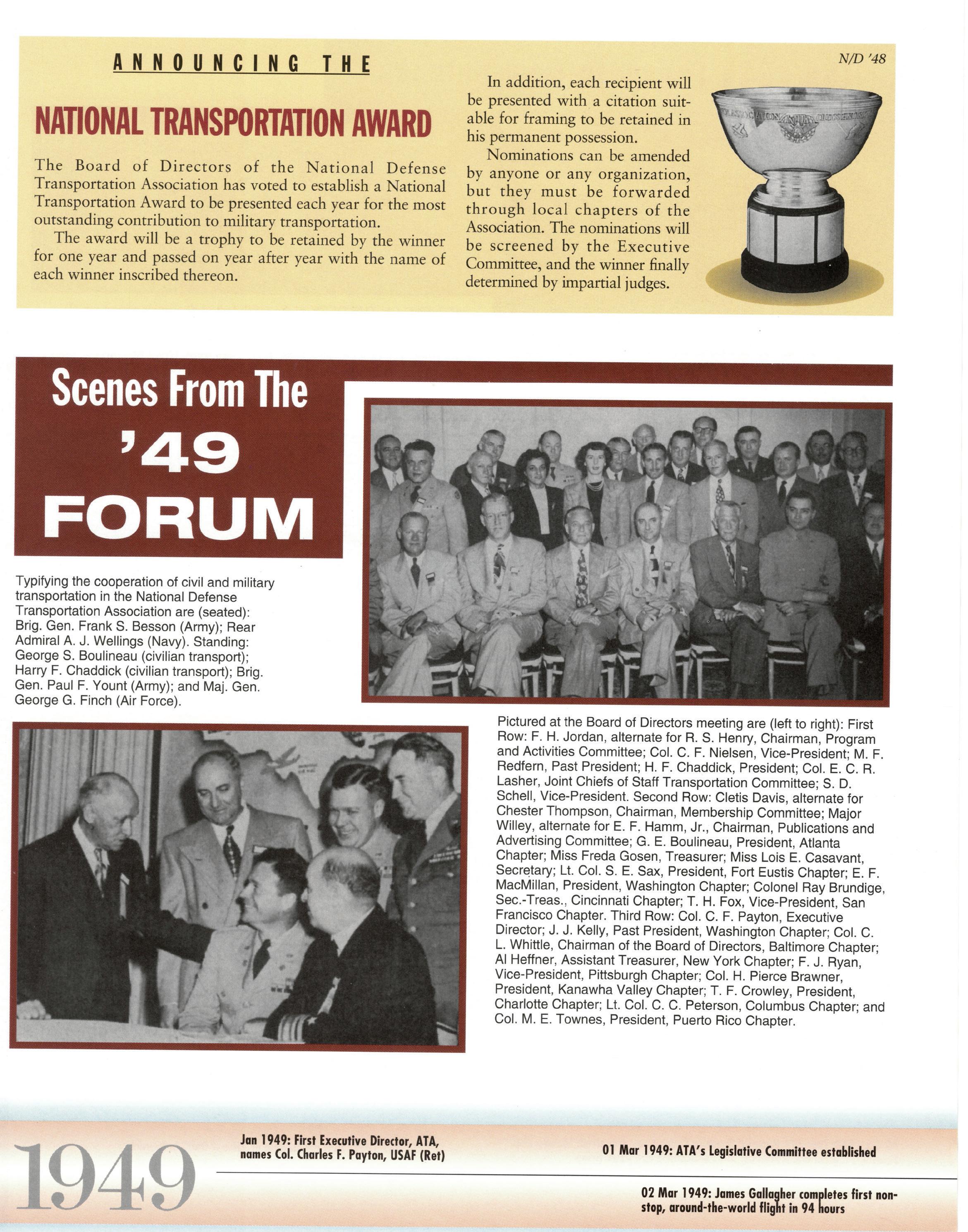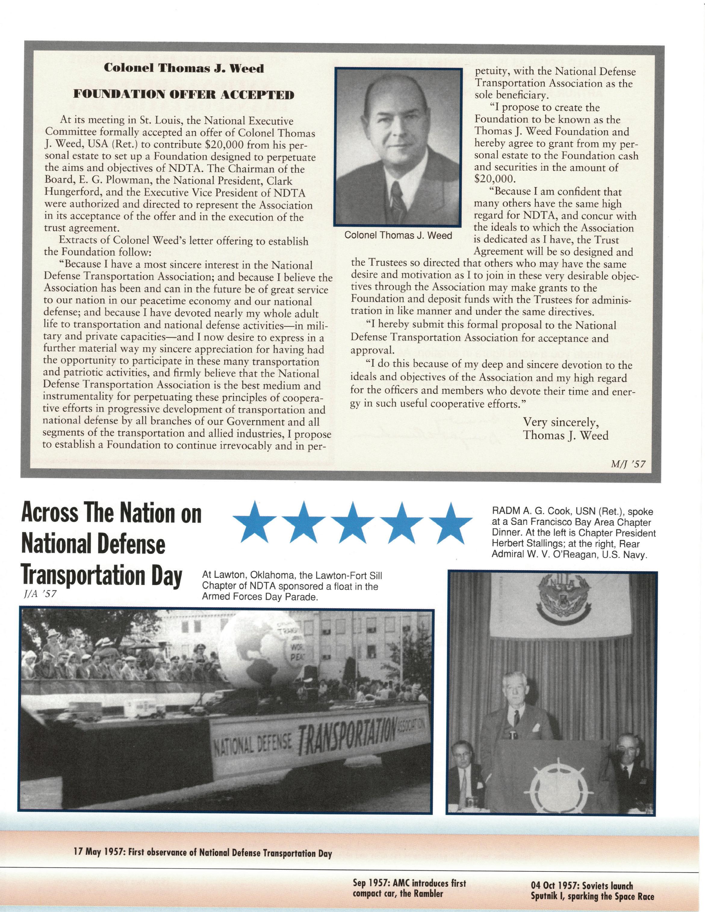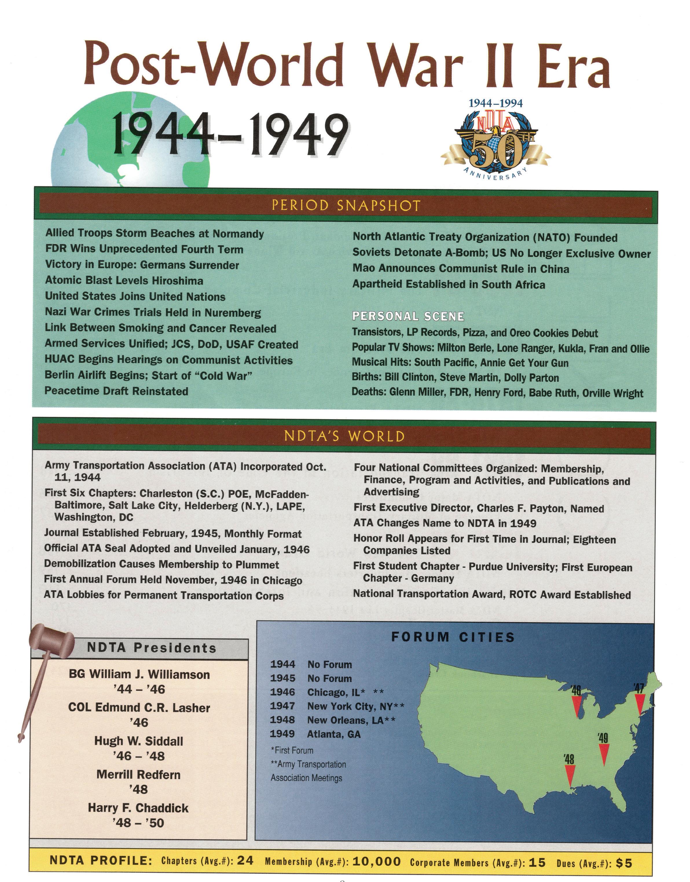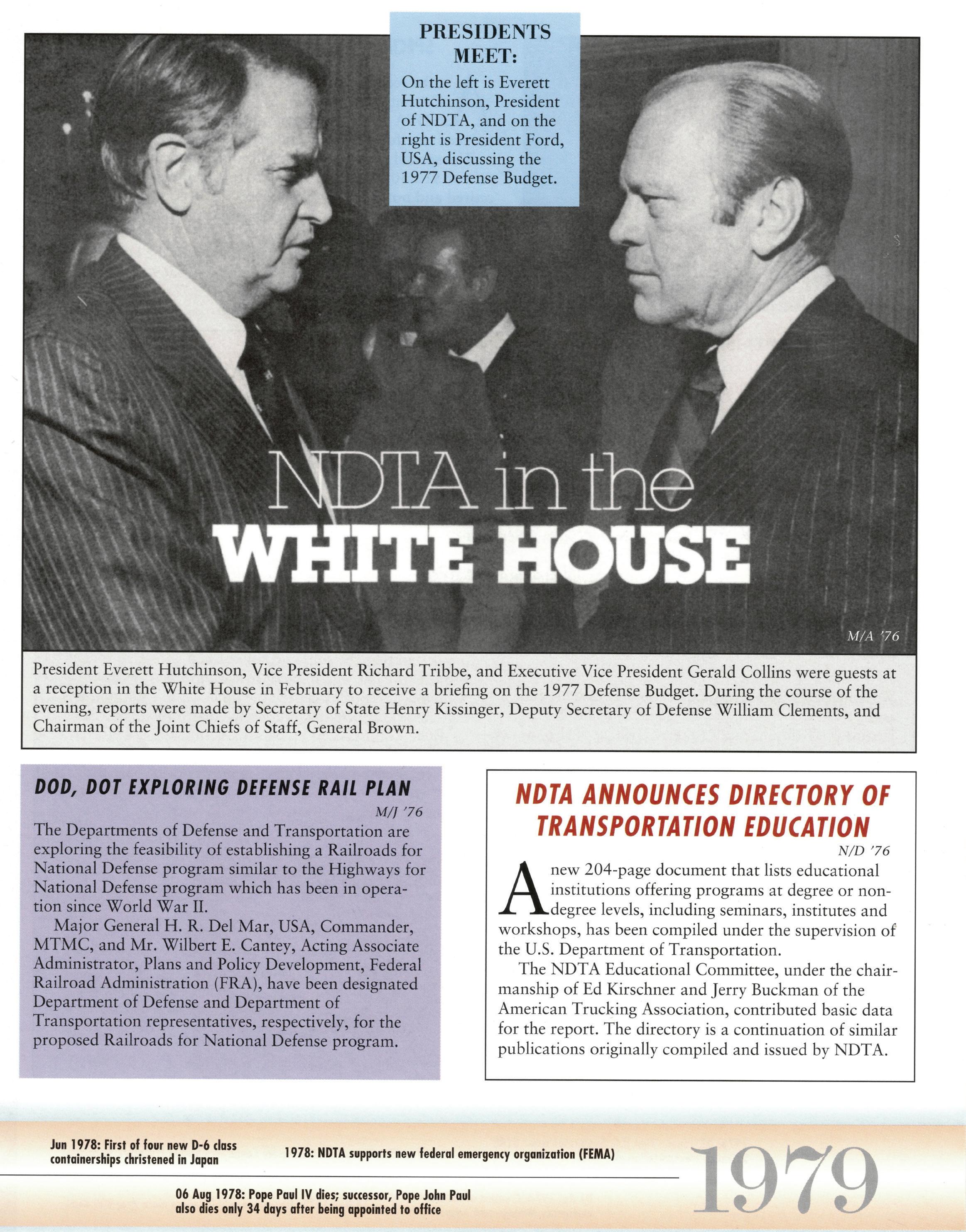 As we celebrate the 75th Anniversary of NDTA, it is good for us to take a moment and reflect on the many challenges faced and overcome by our Nation. Also, to think about the impact that NDTA members have made through countless meetings, con- ferences, expositions, and forums held all over the world, including the United States, Alaska, Hawaii, Europe, and Asia. To help you reflect, we have assembled this special Anniversary Yearbook encompassing all 75 years of our history into one book! Additionally, we commissioned a very special piece of commemorative art that we think tells the NDTA story. We hope you will enjoy them both. In the yearbook, we salute our Service men and women, NDTA members, chapters, government, and industry partners along with everyone in the logistics and transportation enterprise who understands that “nothing hap- pens until something moves!” And at NDTA, we believe that keeping people and things moving in support of our government is what we are all about.