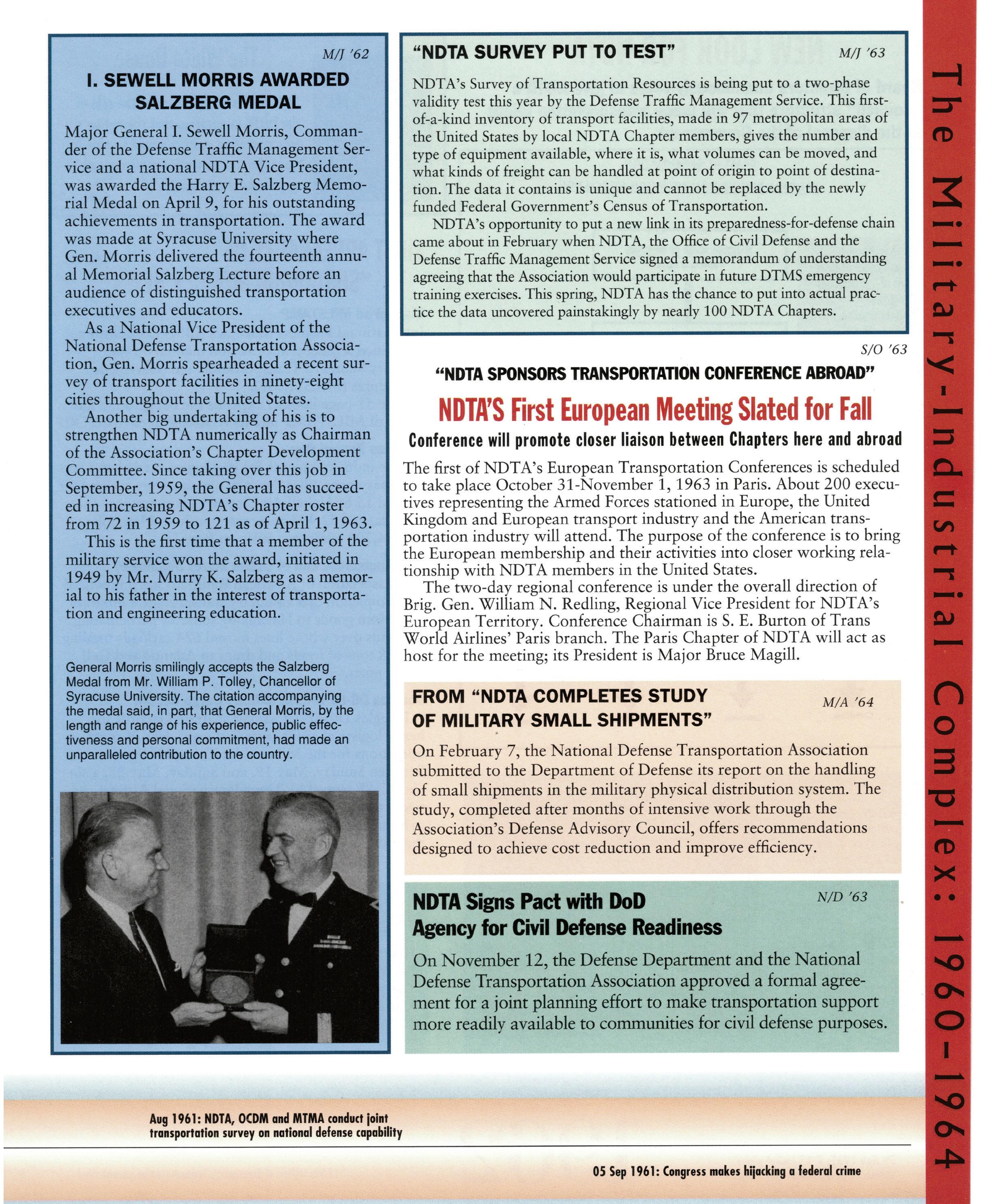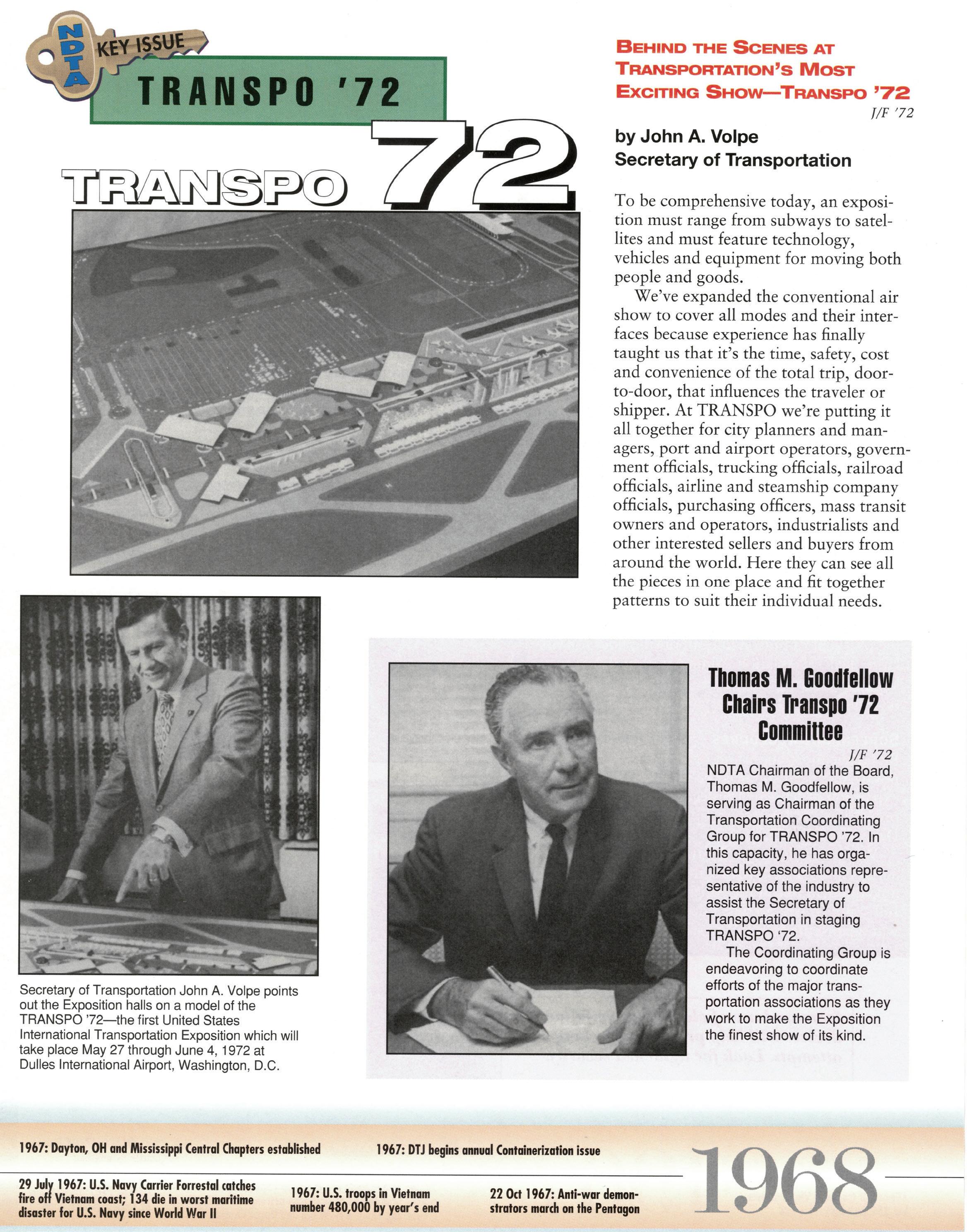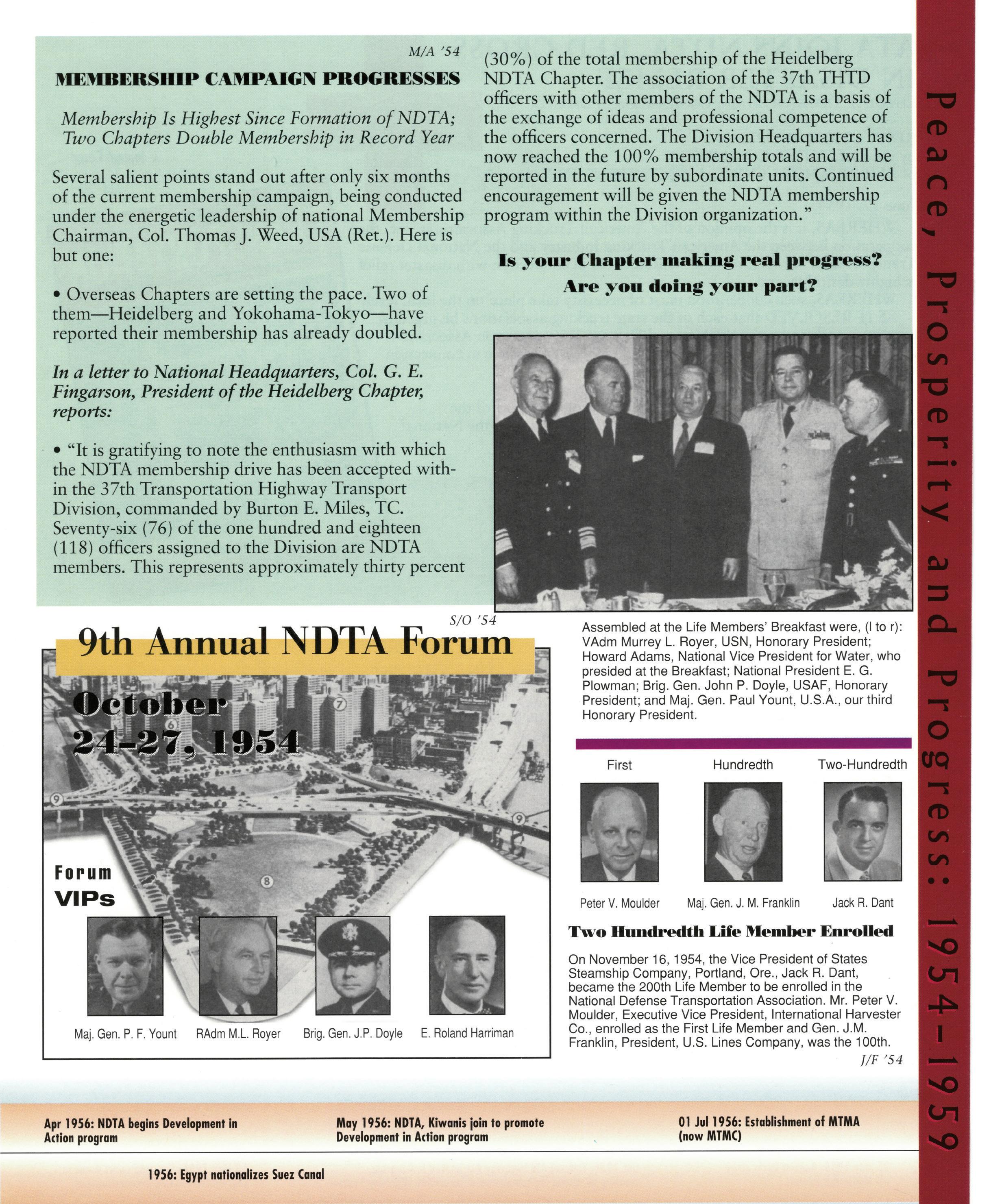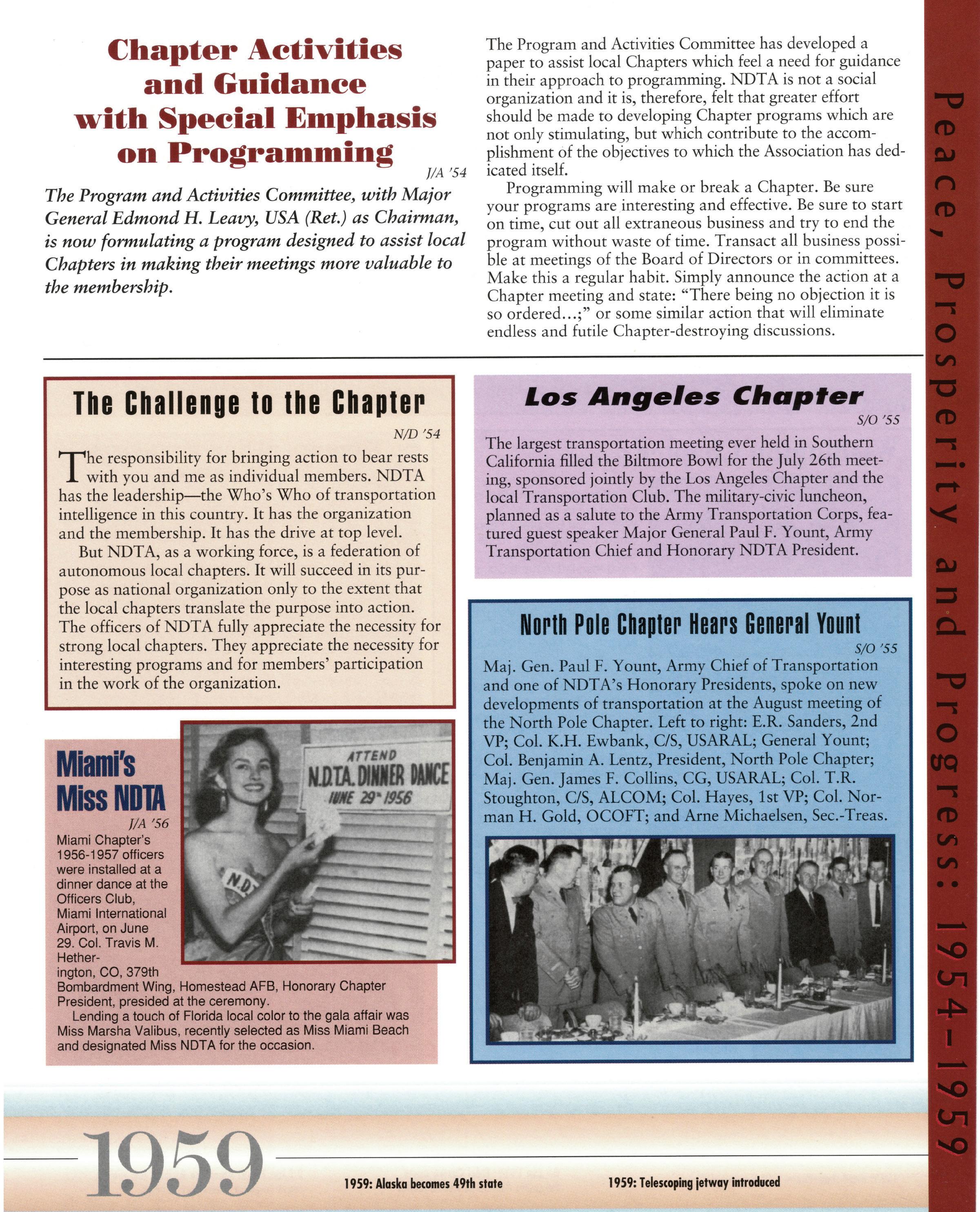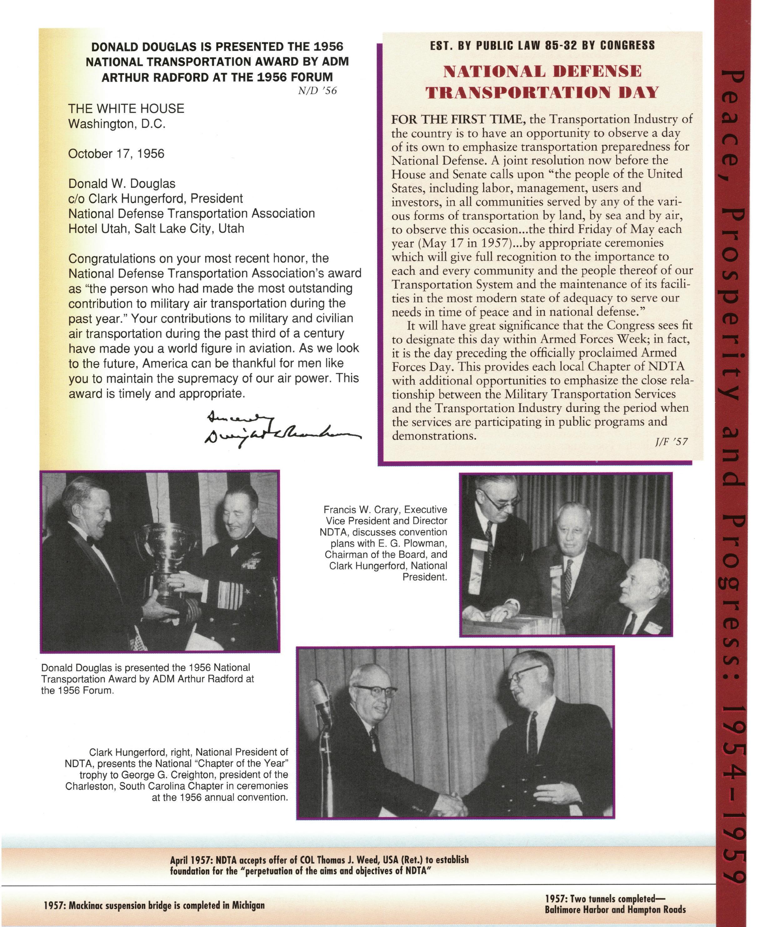 As we celebrate the 75th Anniversary of NDTA, it is good for us to take a moment and reflect on the many challenges faced and overcome by our Nation. Also, to think about the impact that NDTA members have made through countless meetings, con- ferences, expositions, and forums held all over the world, including the United States, Alaska, Hawaii, Europe, and Asia. To help you reflect, we have assembled this special Anniversary Yearbook encompassing all 75 years of our history into one book! Additionally, we commissioned a very special piece of commemorative art that we think tells the NDTA story. We hope you will enjoy them both. In the yearbook, we salute our Service men and women, NDTA members, chapters, government, and industry partners along with everyone in the logistics and transportation enterprise who understands that “nothing hap- pens until something moves!” And at NDTA, we believe that keeping people and things moving in support of our government is what we are all about.