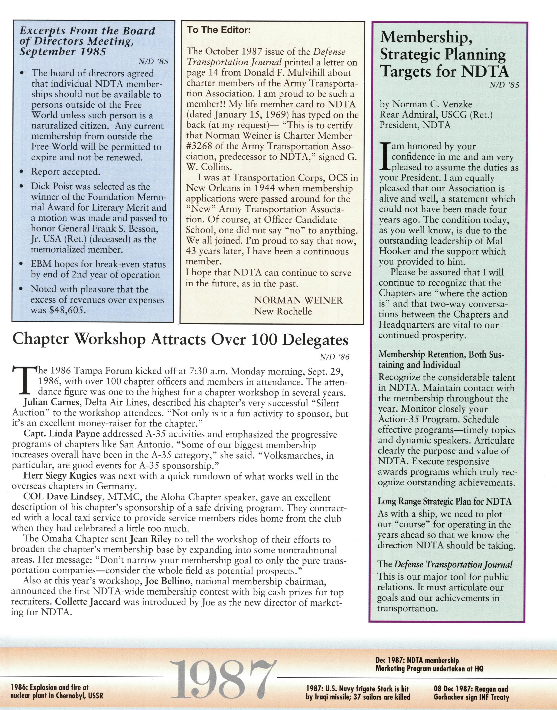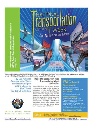 Today and in the future, we are committed to opening new doors and establishing new relationships with govern- ment, universities, and industry leaders. This year we held our first Conference on America’s Ports: Supporting Our National Military Objectives with Christopher Newport University’s Center for American Studies. We will leverage events and meetings like this one to engage, educate, and move forward together. One way this will hap- pen is through the expanded and more interactive ability of the NDTA website, making it an information source available and open to all members of the logistics and transportation community. As we move forward together as partners in this great endeavor, I want to extend my congratulations and sincere appreciation for your support and all you do every day to support our Nation and NDTA.