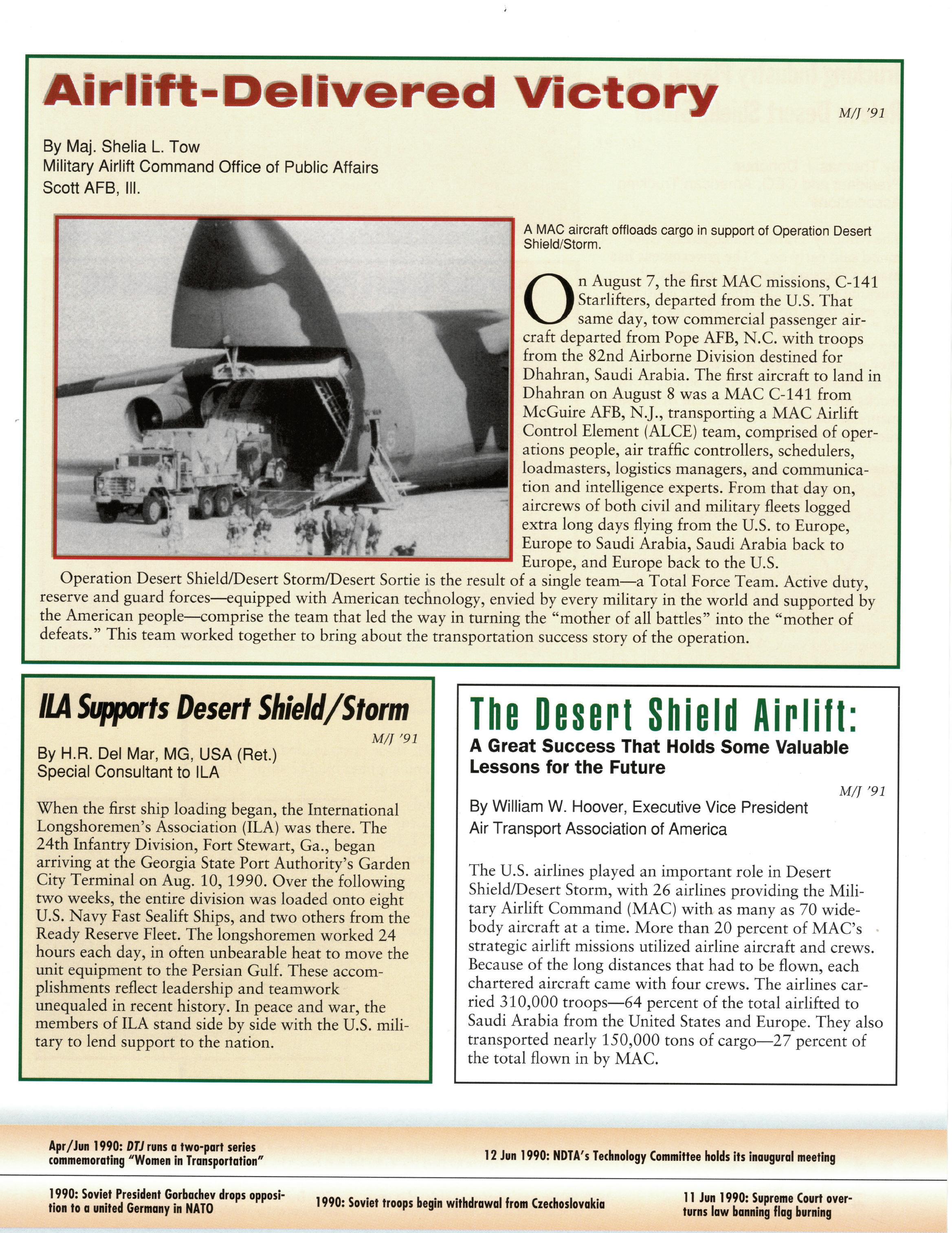Air Mobility Command has consistently benefitted from collaborative relationships with our many industry partners—relationships which have percolated around the shared goals of NDTA members. A cornerstone to wartime airlift, we enjoy open communication with member companies of the Civil Reserve Air Fleet. We have established fellowships for Airmen to share innovative ideas, fostered mutual learning, and sharpened the edge of fleet-wide command and control functions through touring operations facilities. We have worked together to tackle pilot shortage concerns and adopted many shared business practices that improve our entire aircraft fleet. AMC has benefitted time and again by the observations gleaned through our friends in industry. This synergy is invaluable. ...
