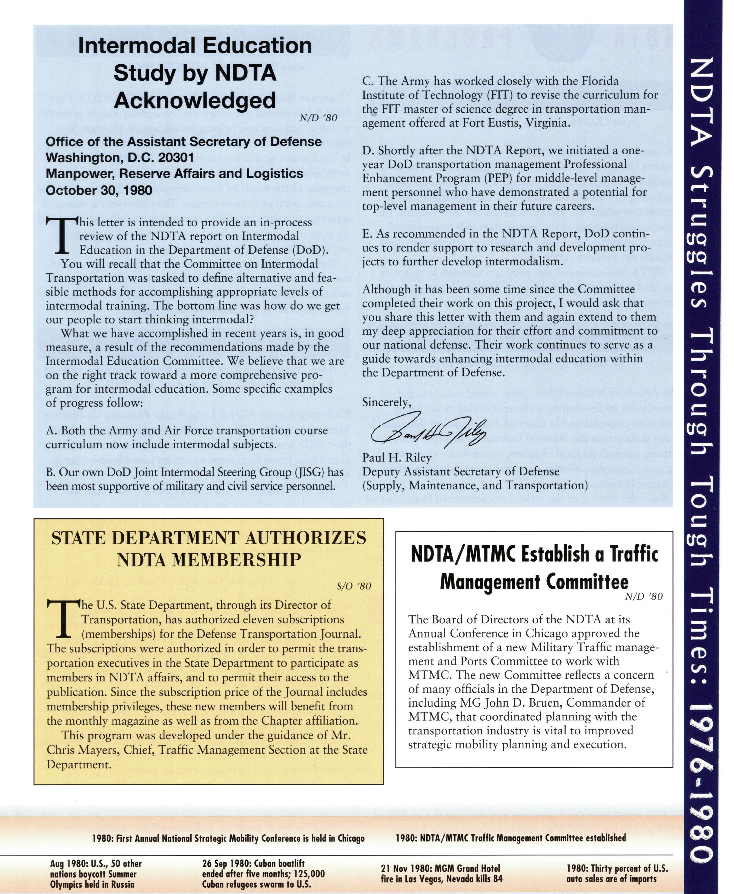 during my first 10 years as a civil servant. Upon selection as the senior travel official for DOD, my association with the logistics/transportation community and accordingly, NDTA took off overnight. Over the next 2 1/2 years I have come to see the tremendous value that an organization like NDTA brings to both industry and the federal government. It clearly fulfills a vital and indispensable role in the increasingly critical relationship and interdependency between industry and the federal government from an operational and commercial travel perspective. It enables professional and personal relationships that build trust and result in evidence-based decision making. It promotes efficient and effective maritime operations. It ensures world class transportation and sustainment to the warfighter. ...