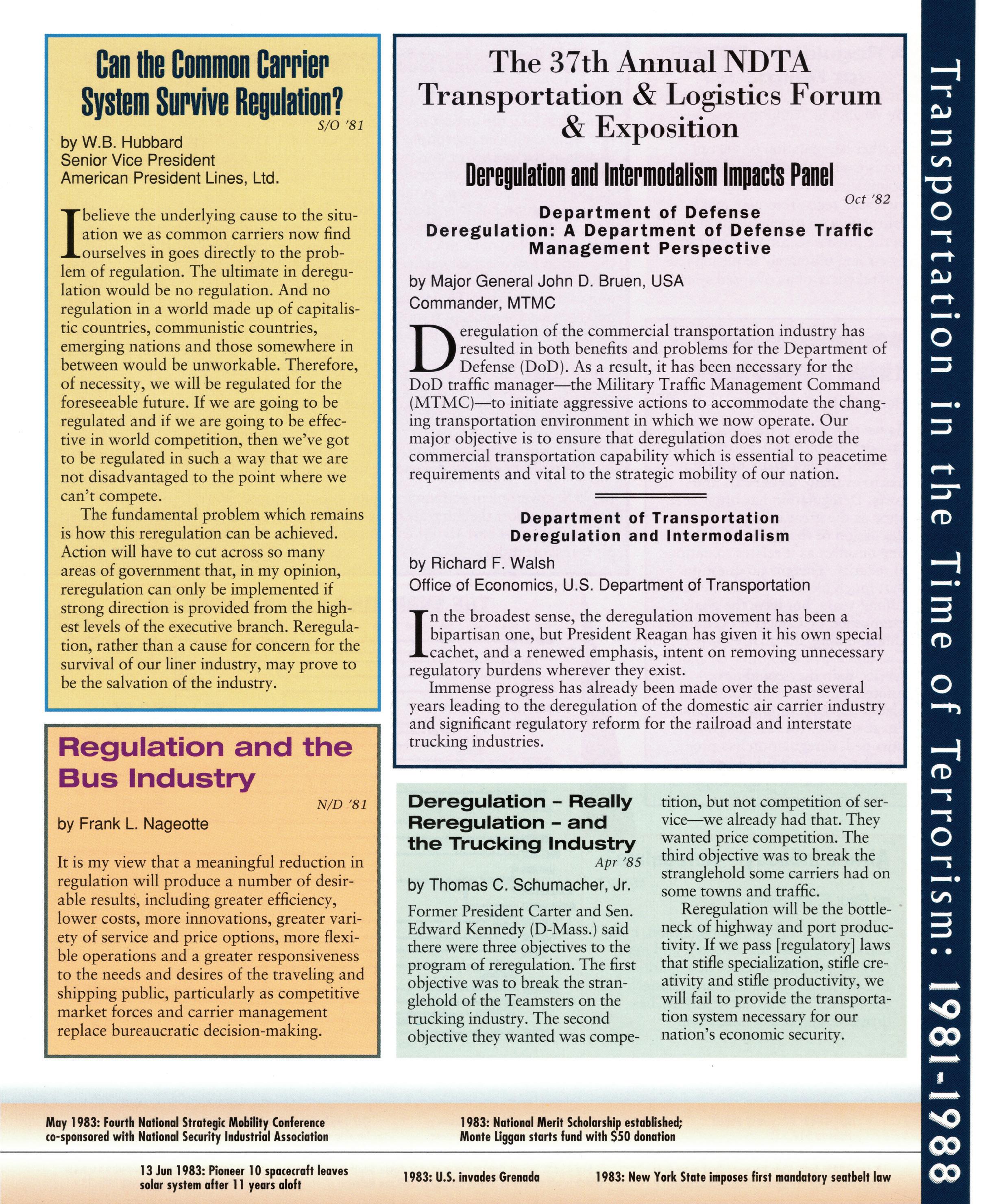 From these vantage points both inside government and as a member of industry, the absolute value of an organization like NDTA—and there is no other like it— has become crystal clear to me: NDTA builds trust. It is the line of communication that binds USTRANSCOM to its fourth “component”—the civilian transportation industry. It fulfills a truly vital and indispensable role made even more important by the increasingly multi-modal nature of logistical movements. NDTA encompasses all modes of transportation and facilitates the kind of face to face, personal relationships that enable tough tasks to get done when the time comes because of trust that has already been established through those frequent interactions and developed relationships. ...