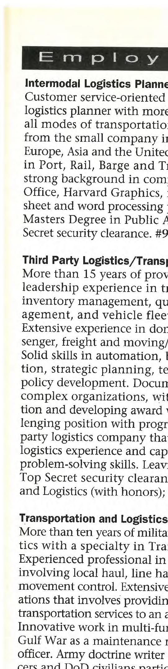 Customer service-oriented transportation manager and logistics planner with more than 15 years experience in all modes of transportation Planned logistics support from the small company in the multi-national level in Europe, Asia and the United States. Extensive experience in Port, Rail, Barge and Truck operations. Extremely strong background in computer softwar e packages: MS Office, Harvard Graphics, numerous database , spreadsheet and word processing programs. BS in Aeronautics, Masters Degree in Public Administration; current Top Secret security clearance. #95-118