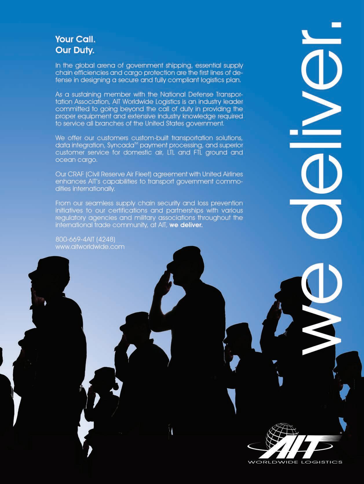Defense Transportation Journal (ISSN 0011-7625) is published bimonthly by the National Defense Transportation Association (NDTA), a non-profit research and educational organization; 50 South Pickett Street, Suite 220, Alexandria, VA 22304-7296, 703-751-5011. Copyright by NDTA. Periodicals postage paid at Alexandria, Virginia, and at additional mailing offices.