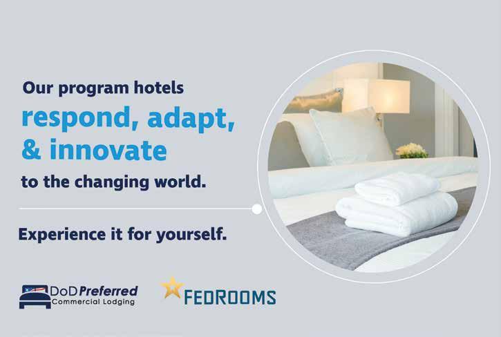 Military Members Save up to 15%* Wyndham Hotels & Resorts welcomes active and retired military members, veterans, and their spouses as our guests of honor with discounts and Wyndham Rewards member perks. Plus, we partner with non-profit organizations to support military families, disaster relief, and more through Wyndham Rewards points donations. Learn more at www.wyndhamrewards.com/military. HONORING OUR MILITARY —TODAY & EVERY DAY *Subject to availability at participating hotels in the U.S. and Canada. Discount open to current and retired members of the U.S. and Canada militaries and their spouses and children (18+). Must be a Wyndham Rewards member to receive points. Offers void where prohibited by law and subject to change/cancellation at any time. Additional restrictions apply; subject to full terms and conditions at www.wyndhamrewards.com/military. © 2021 Wyndham Rewards, Inc. All rights reserved. WYN-2021-Ad-HP_03ab.indd 1 5/11/21 7:34 AM Cont’d from Pres. Corner pg. 13