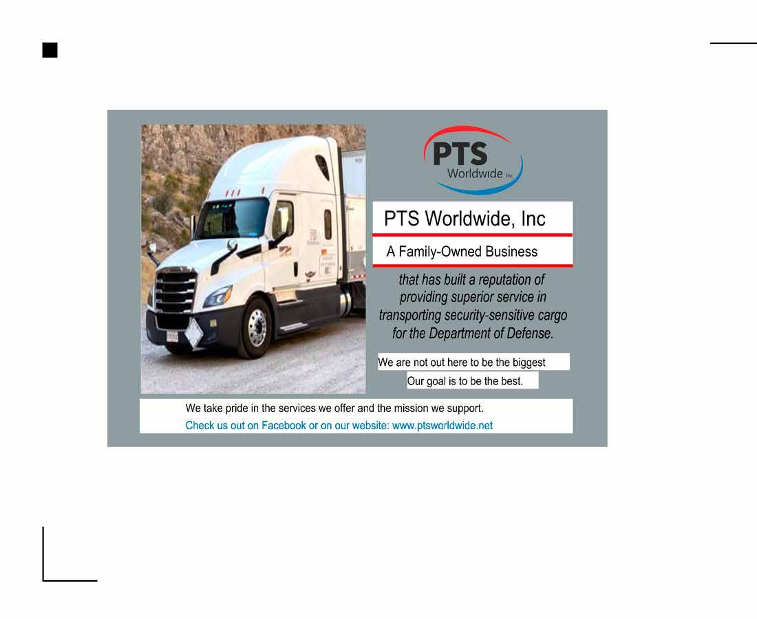 6 | Defense Transportation Journal | DECEMBER 2022 AMERICAS: FLORIDA, NEW YORK, CHICAGO EUROPE: FRANKFURT, AMSTERDAM, MADRID MIDDLE EAST: DUBAI ASIA: TOKYO, SHANGHAI, KUALA LUMPUR, HONG KONG Email: dodsales@nationalairlines.com I GoNational.com I NationalAirlines.com I NationalAirCargo.com Fleet of six B747-400Fs Tailor-made Logistics Solutions for the Department of Defense (DOD) CRAF Carrier Partner Network with Worldwide Commercial Airlines Troop Surges/ Rotation of Forces Aviation Parts & AOG Immediate Shipments Timely Movement of Classified Cargo to Complex Locations Diversity Programs/SBA (the U.S. Government) 24X7 Global Operations Support Web-Based Tracking & Visibility Worldwide