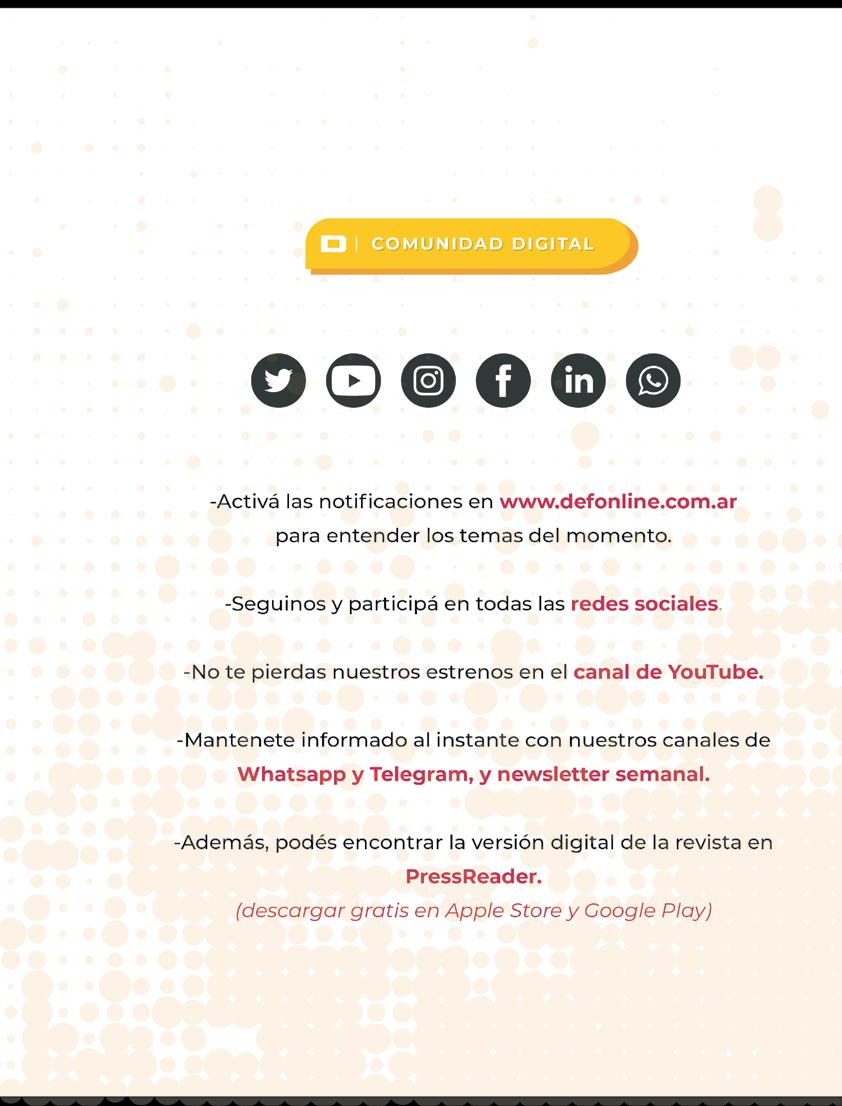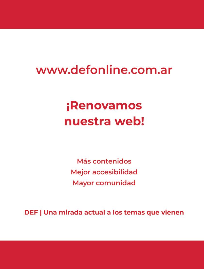 DEF es una publicación de TAEDA EDITORA SA. Derechos reservados. Se prohíbe su reproducción total o parcial sin autorización. Las opiniones vertidas en esta revista no representan necesariamente las de TAEDA EDITORA SA. Registro de Propiedad Intelectual N.º 476240. Piedras 1333 2.º “A”, Buenos Aires, Argentina. (5411) 4300-1186.