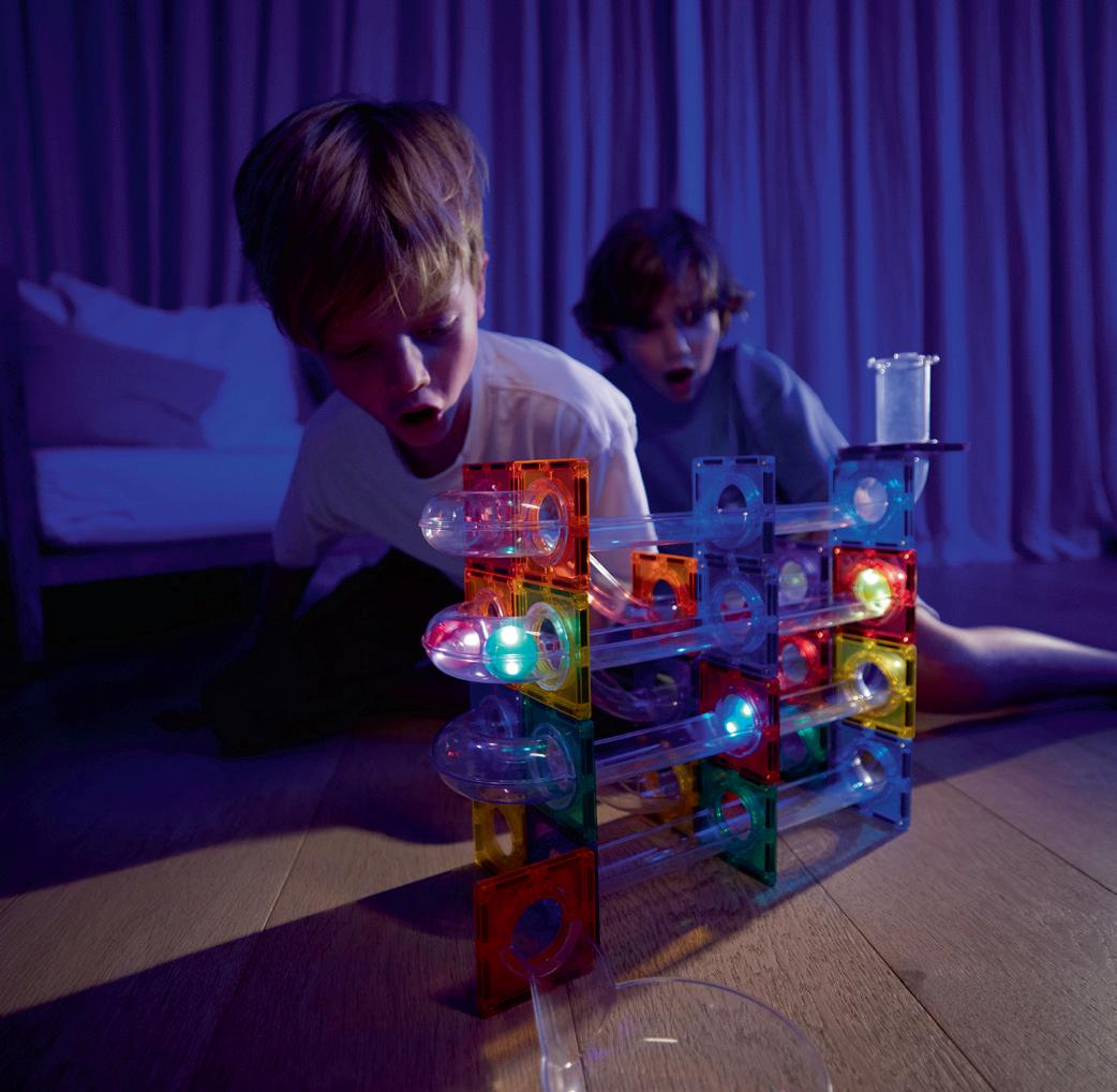 Bouw je eigen spectaculaire magnetische racebaan waar kinderen zelf bepalen hoe de weg loopt.