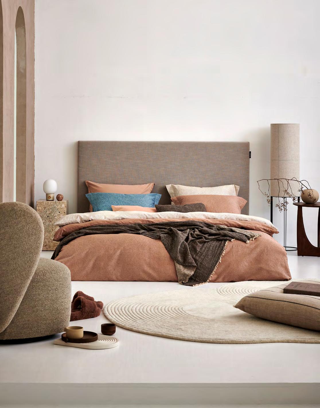 1. Exclusieve linnen dekbedovertrek PURE 7 in MOONSCAPE, OCEANVIEW en CREAM TAN met 300 count satijnen achterkant voor extra zachtheid. Door een unieke wasbehandeling heerlijk soepel met softe kreuk - 1-persoonsset 169,95 - 2-persoonsset 319,95 lits-jumeauxset 339,95 - 2. PURE 64 OCEANVIEW & CREAM TAN - bedsprei 180x260 - 169,95 | 260x260 - 239,95 spreisloop 60x70 - 44,95 | 40x50 - 34,95 - 3. HOME 95 Een warme, zachte plaid van wol melange, wafelstructuur, afgewerkt met franjes. Plaid 130x220 - 89,95 - bedsprei 160x260 - 139,95 - kussensloopje 40x55 - 39,95 1. 2. 3. 4 MAGAZINE HERFST / WINTER 2022 1.1. Headboard (combatex) marmer blok van Menu (via Designtales)