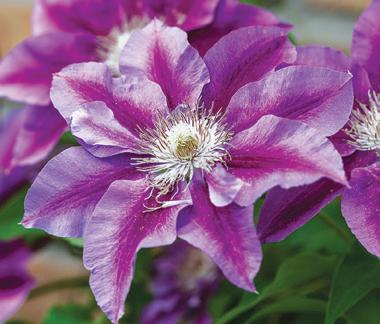 Large 4–5" sapphire-blue blossoms with golden stamens, grows on new and old vines