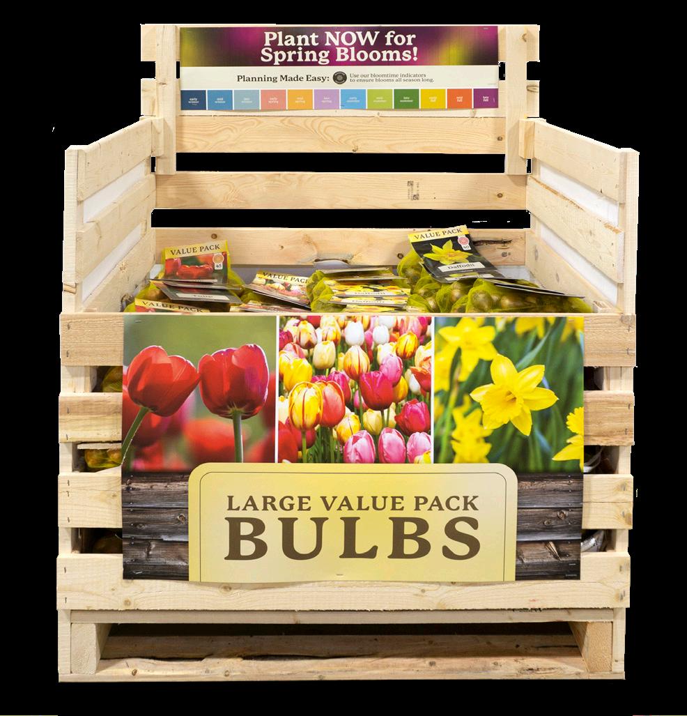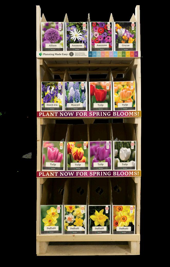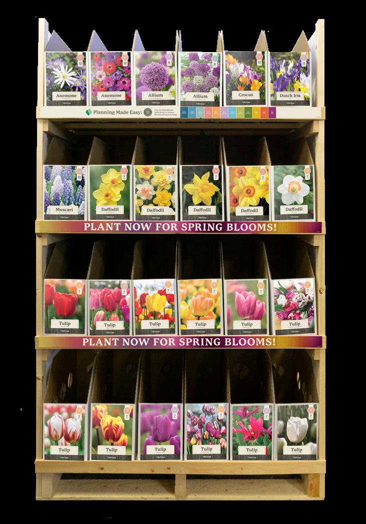 With 240 colorful retail ready packages, this display offers customers a large variety of their favorite easy-to-grow fall bulbs! This beautiful display arrives pre-assembled and includes eye-catching POP. The color coded ‘Planning Made Easy’ strip makes it easy for customers to fill their gardens with blooms all season long.