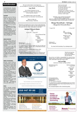 BERKEL EN RODENRIJS RK Kerk – elke do. 19.00 uur Rozenkrans (O.L.V. Geb. kerk); za. 24 juni 19.00 uur geen viering (Pius X kerk); zo. 25 juni thema Duurzaamheid en Milieu, 09.30 uur Woord- en Communieviering m.m.v. Pius X koor (Huize St. Petrus); 11.00 uur Eucharistieviering m.m.v. Cantemus Domino (O.L.V. Geb.kerk). Herv.Gem. (Dorpskerk) – zo. 25 juni 10.00 uur uitzending via Lansingerland FM, ds. A. Gooijer, 19.00 uur jeugddienst, ds. C.M. van Loon, Rotterdam. Geref.Kerk B&R/B’hoek – zo. 25 juni 10.00 uur Dienst van Schrift en Tafel, ds. A. v.d. Wel. Geref.Kerk Vrijgem. – zo. 25 juni 10.00 uur br. D. de Gelder, 16.30 uur ds. M. van Leeuwen. Wijnstokgem (Rodenrijseweg 295) – elke zondag 10.00 uur samenkomst, clubs en crèche.