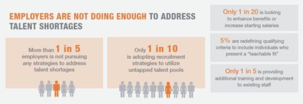 Despite their admitted challenges in filling positions, more than one in five employers are not pursuing any strategies to address their talent shortages. In fact, only one in ten is adopting recruitment strategies to access untapped talent pools.