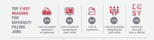 35% of employers surveyed in the 2015 Talent Shortage Survey reported that the top reason they have difficulty filling jobs is a lack of available applicants. 34% of respondents said they can’t fill positions because their talent pool has a lack of technical skills ﴾hard skills﴿. The other three of the top five reasons it’s difficult to fill positions is due to lack of experience ﴾22%﴿, lack of workplace competencies, or soft skills ﴾17%﴿, and encountering candidates looking for more compensation than is offered.