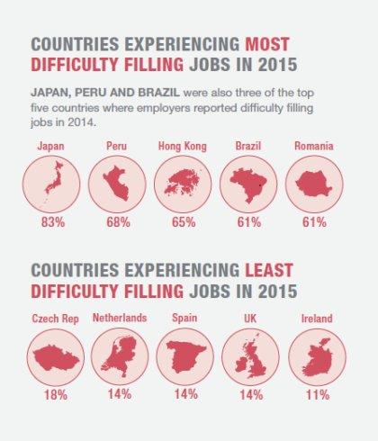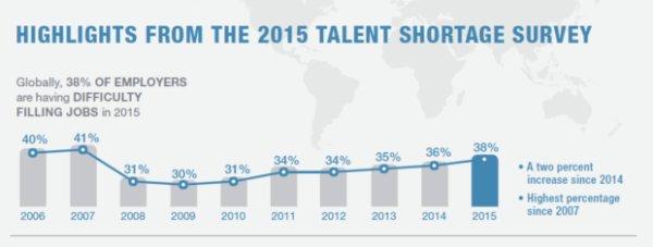 In 2015, 38% of employers were having difficulty filling jobs, which is the highest number since 2007. That number is a global average, with 32% of employers reporting difficulty in the United States.