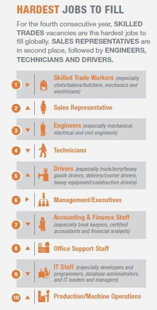 For four years straight, skilled trade jobs are the most difficult to fill, especially chefs, bakers, butchers, mechanics, and electricians. Sales representatives, engineers, technicians, and drivers make up the remaining of the top five most difficult jobs to fill. Now we can see why a lack of technical skills contributes heavily to the lack of candidates those skills are needed in four of the top five most difficult jobs to fill.