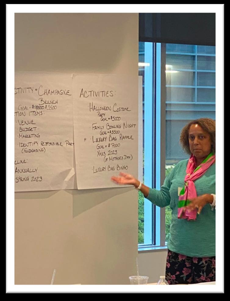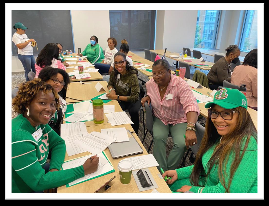 The Phi Nu Omega chapter retreat took place on October 1, 2022 at the Microsoft Building in Reston, Virginia . The theme for the retreat was PNO F .I.T . Focused, Informed, and Transforming . To get focused sorors engaged in a meditation exercise . Sorors got informed by hearing about the sorority's new program initiatives, sharing our thoughts and insights on ways we can make PNO better, and learning about each other through several fun sisterly relations activities. To help PNO transform , sorors established four strategic priorities on which the chapter will focus this upcoming year: membership growth, sisterly relations, technology, and having a signature fundraising event. The strategic planning sessions were led by Guest Facilitator Soror Wanda King. The retreat concluded with a champagne toast and a chapter stroll. PNO is ready to SOAR and ready to serve .