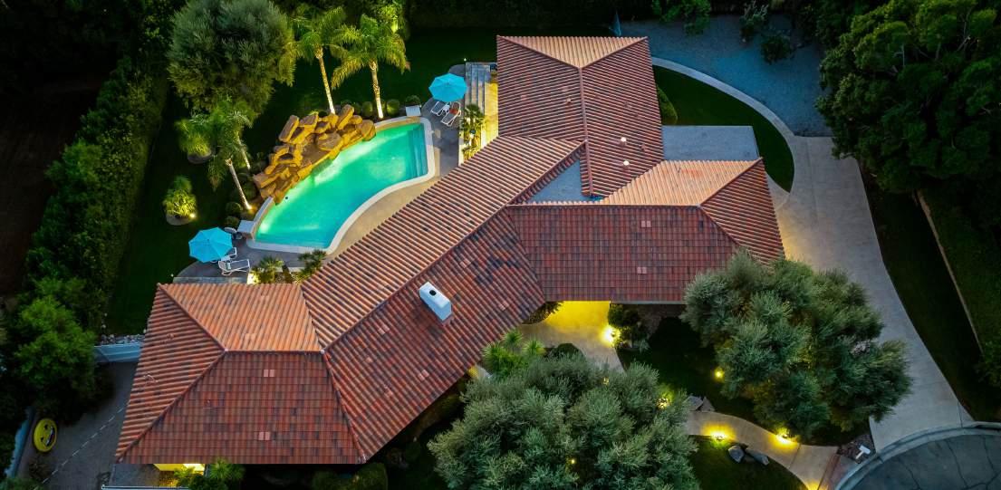 Outdoors, a 20,000-gallon pool with a sculptural rock waterfall anchors the backyard retreat, surrounded by lush landscaping and generous entertaining spaces. Offered fully furnished, the home is truly turn-key, with upgrades including newly stained concrete, refreshed garden beds, a new pool heater and pumps, an outdoor shower, and a full-length misting system.