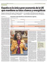 España es la única gran economía de la Unión Europea que conserva un gravamen propio a los supuestos beneficios extraordinarios de la banca y las empresas energéticas, dos años después de la crisis inflacionista que desencadenó la invasión de Rusia a Ucrania. Ni Francia, ni Alemania, ni Italia contemplan ya ese tipo excepcional de impuestos en sus sistemas fiscales, solamente están vigentes dentro de la Unión en Hungría, Lituania, Eslovaquia y Chequia, y fuera de ella en Reino Unido. Así se desprende, un informe de la organización estadounidense Tax Foundation. El economista, 26-09-2024