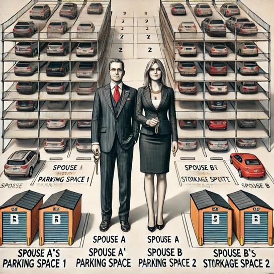 La adquisición se realiza en un único acto de compra y se divide entre ambos cónyuges: cada uno de ellos adquiere, de manera proporcional, el 50% de la vivienda y, además, uno de los cónyuges adquiere una plaza de garaje y un trastero, mientras que el otro cónyuge adquiere la segunda plaza de garaje yelsegundotrastero.