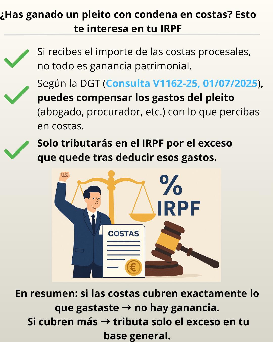 La DGT lo incorpora en V3097-20 (13/10/2020) y lo reitera en V1162-25: el importe de costas se compensa con los gastos del pleito; solo el exceso tributa como ganancia patrimonial en la base general.