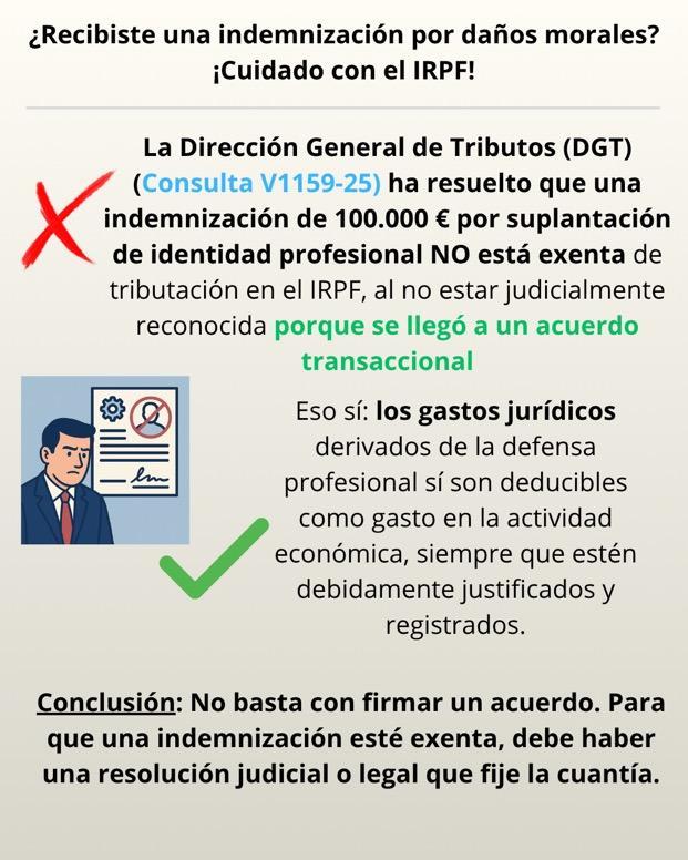 TRABAJO. La DGT niega exención en IRPF para indemnización por suplantación de identidad profesional, pero admite la deducción de gastos jurídicos.