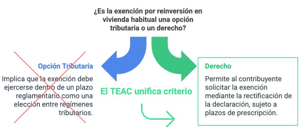 ▪ El TEAC unifica criterio y declara que la exención por reinversión en vivienda habitual no es una opción tributaria sujeta al artículo 119.3 LGT, sino un derecho del contribuyente. Por tanto, puede ser ejercido mediante la solicitud de rectificación de la autoliquidación, siempre que no haya prescrito el derecho.