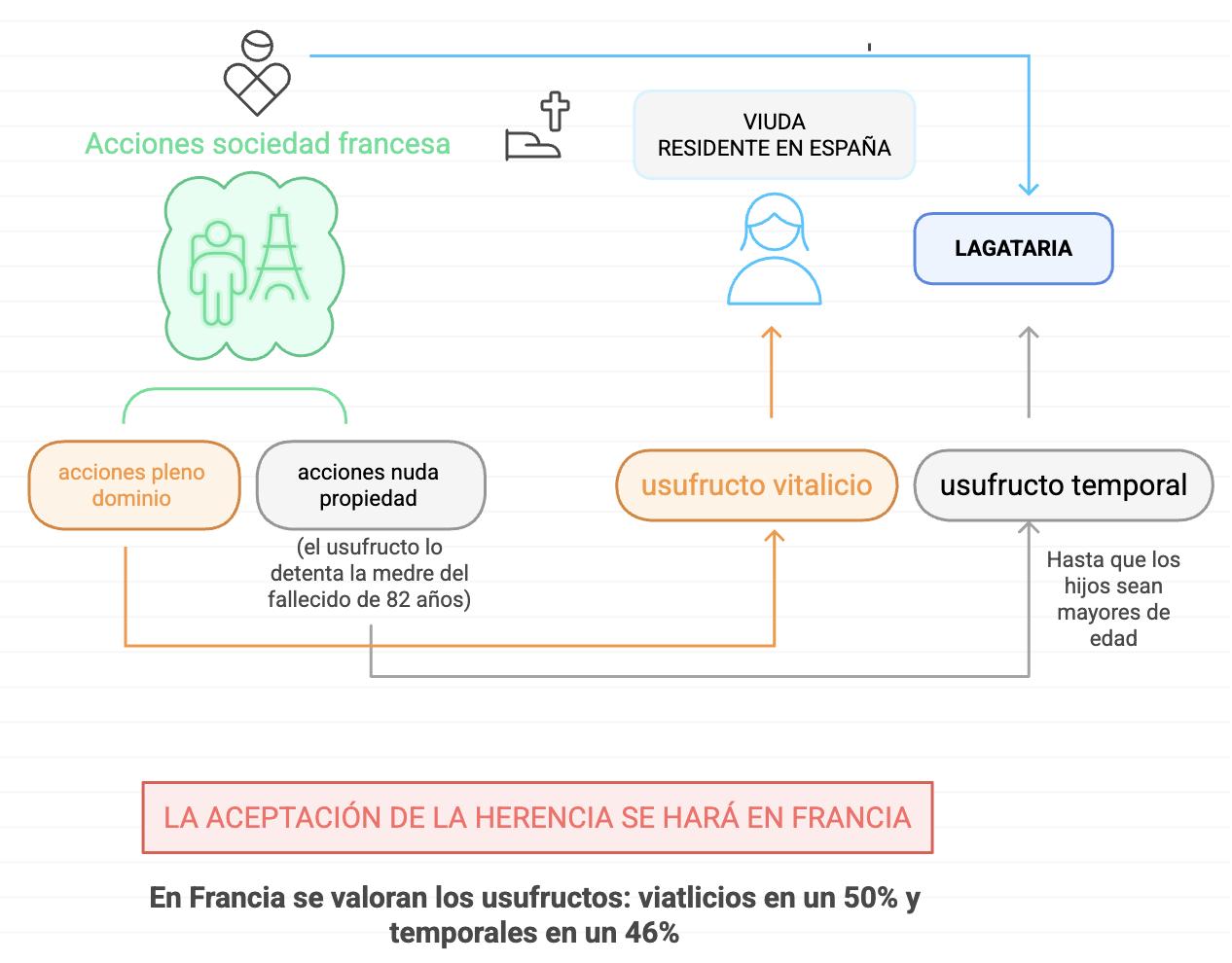 ▪ La aceptación de la herencia se hará en Francia conforme al derecho francés, que valora los usufructos en un 50% (vitalicio) y 46% (temporal).