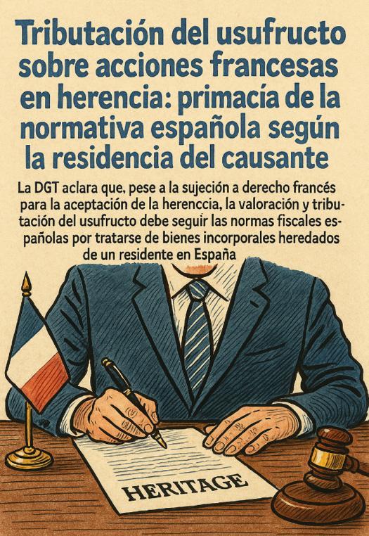 La DGT declara que, pese a la sujeción a derecho francés para la aceptación de la herencia, la valoración y tributación del usufructo debe seguir las normas fiscales españolas por tratarse de bienes incorporales heredados de un residente en España