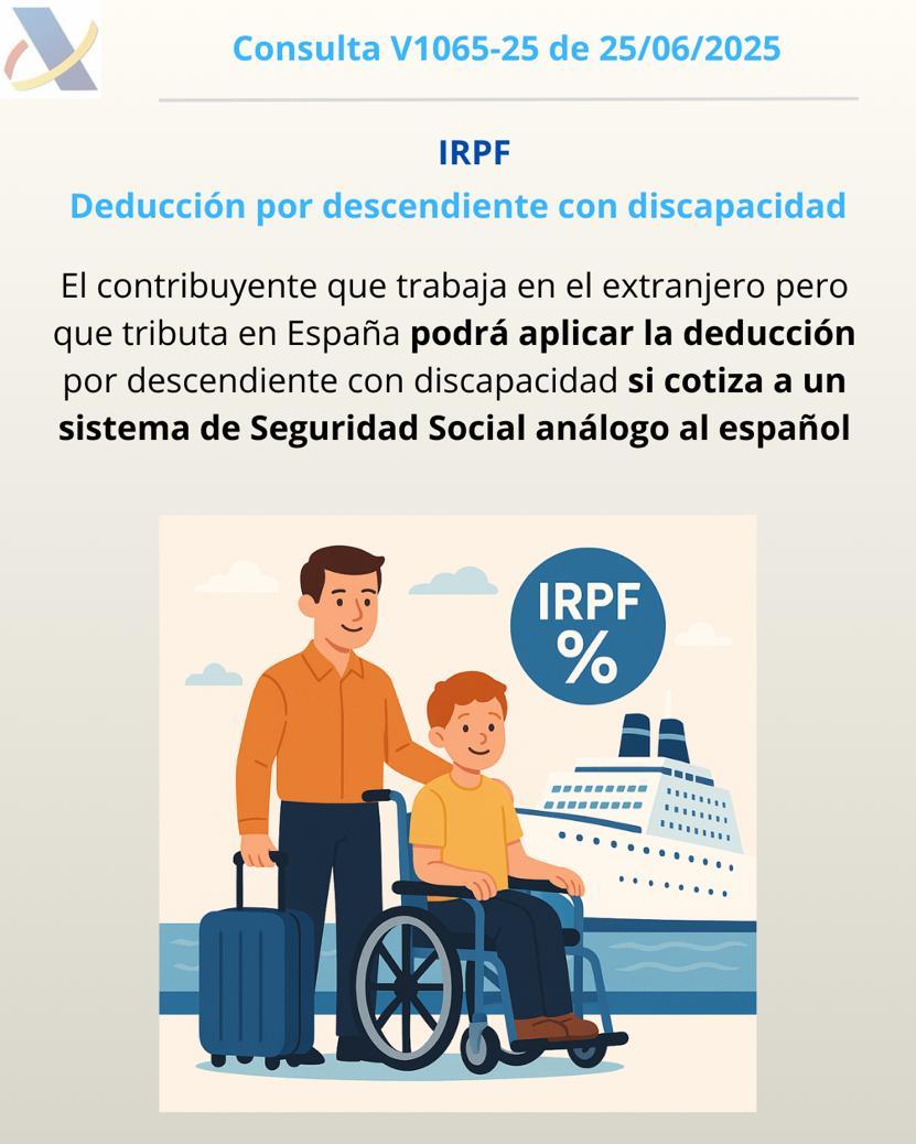 IRPF/DEDUCCIÓN POR DESCENDIENTE CON DISCAPACIDAD. La DGT recuerda que los contribuyentes que trabajan fuera de España pueden aplicar la deducción por descendiente con discapacidad si cotizan en un sistema público análogo a la Seguridad Social española.