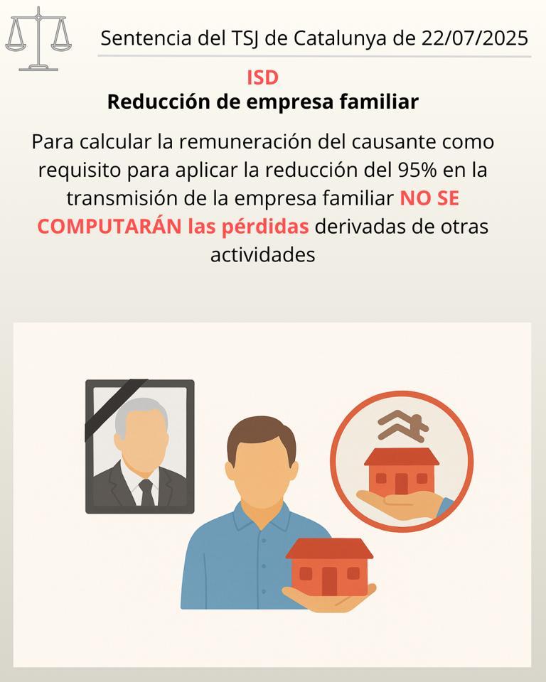ISD. REDUCCIÓN CATALAN POR ADQUISICIÓN DE EMPRESA FAMILIAR. El TSJ de Catalunya determina que para calcular la remuneración del causante de las funciones de dirección no se podrá computar las pérdidas de otras actividades.