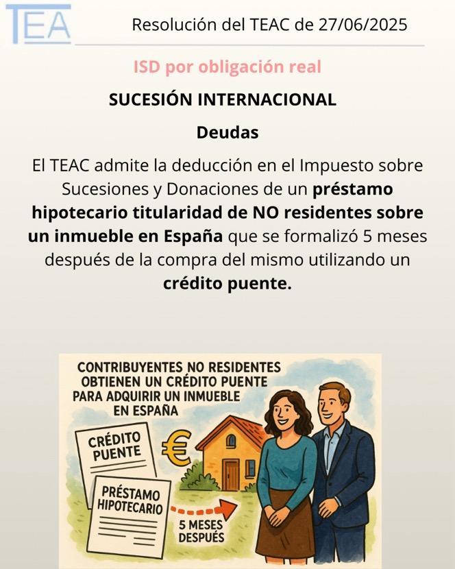 ISD. OBLIGACIÓN REAL. El TEAC admite la deducción de un préstamo hipotecario (inicialmente un crédito puente) en sucesión internacional cuando los contribuyentes no residentes acreditan que el crédito fue destinado a la adquisición del inmueble.