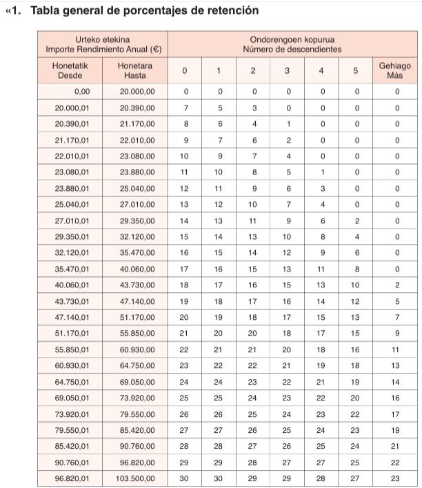 1.º Tratándose de pensiones y haberes pasivos, serán de aplicaciónlosporcentajesderetencióndelacolumnadela tabla correspondientes a contribuyentes con un descendiente. A los exclusivos efectos de determinar el porcentajederetención aplicable,procederá la elevación al año de las cantidades que como tales pensionistas o titulares de haberes pasivos perciban quienes adquieran tal condición duranteelejercicio.