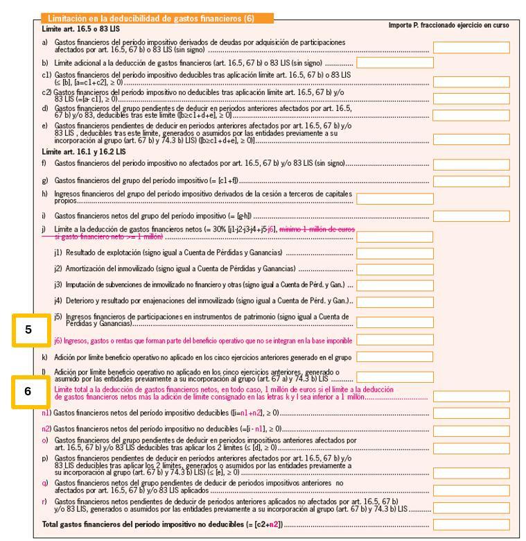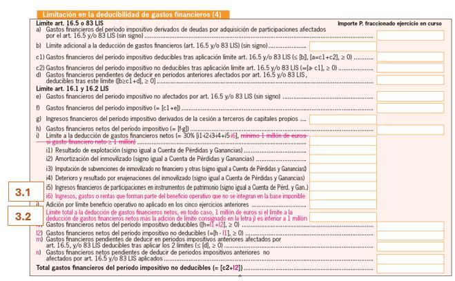 La nueva letra l) recogerá el importe del límite total a la deducción de gastos financieros netos, en todo caso, 1 millón de euros si el límite a la deducción de gastos financieros netos más la adición de límite consignado en las letras k y l sea inferior a 1 millón