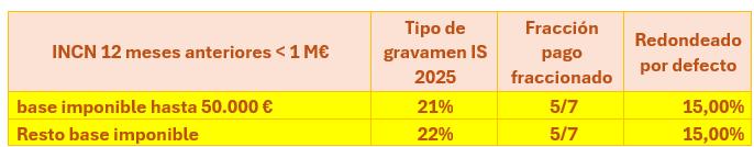 Tipo de gravamen IS 2025 Fracción pago fraccionado
