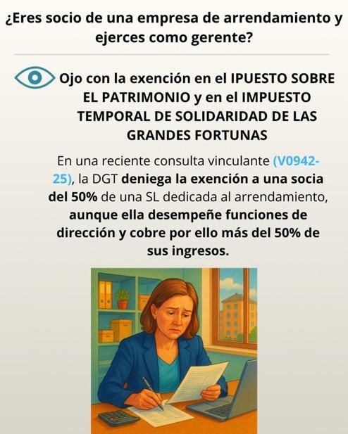 Una socia y gerente de una sociedad de arrendamiento no cumple con los requisitos formales y materiales para acogerse a la exención de participaciones en entidades