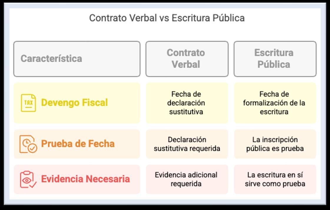 ▪ Cuando se efectúa un contrato verbal de compraventa, los interesados deben presentar su autoliquidación en plazo, acompañada de una declaración sustitutiva del documento, en la que consten las circunstancias relevantes para la liquidación. La fecha de presentación de la declaración sustitutiva es la que se presume que es la fecha del contrato verbal y la que, por consiguiente, se ha de tener en cuenta a efectos de la prescripción del derecho a liquidar, cuyo cómputo comenzará el día siguiente a aquel en que finalice el plazo reglamentario para presentar la correspondiente autoliquidación