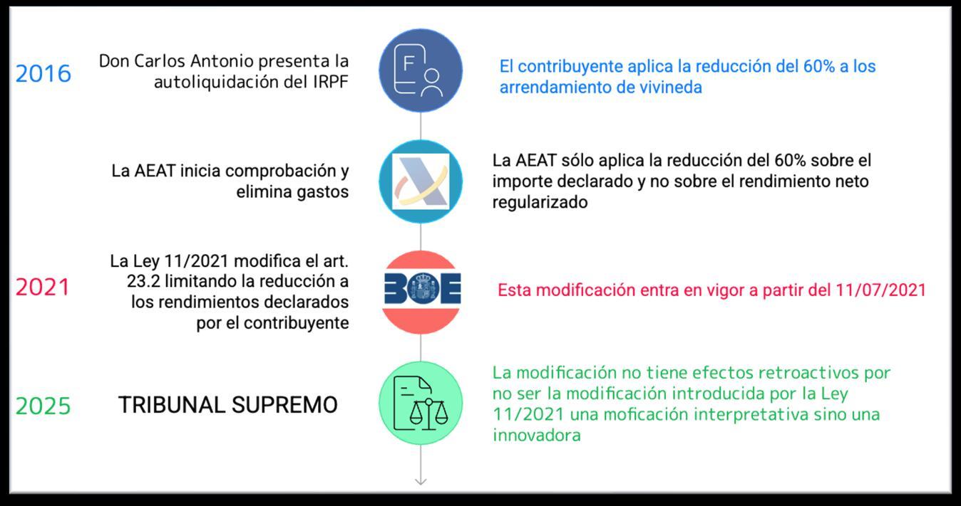 ▪ Don Carlos Antonio interpuso recurso de casación ante el Tribunal Supremo, solicitando que la reducción del 60% se aplicase también al rendimiento regularizado en sede de comprobación, como había defendido la jurisprudencia anterior.